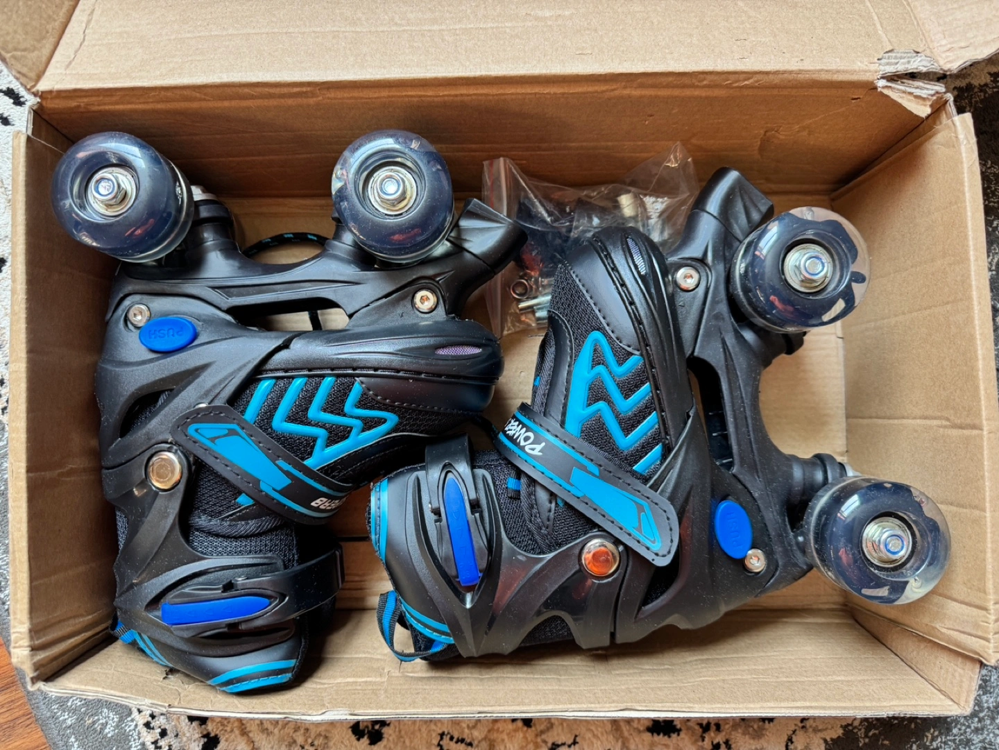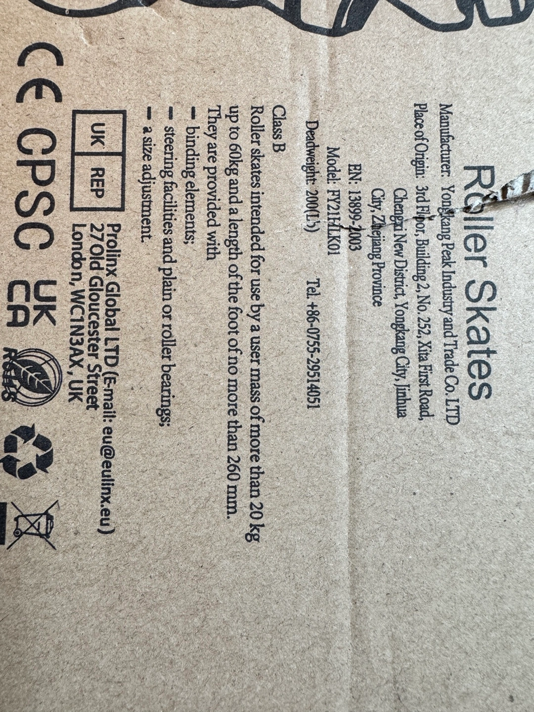 Black and Blue rollerblades in original box. They have a size adjustment and come with extra parts. They have plain roller bearings. They are intended for use by a user of more than 20 kg up to 60kg and a length of the foot of no more than 260 mm. They are provided with binding elements: - steering facilities; - size adjustment; Pick up in Bradford $65 obo