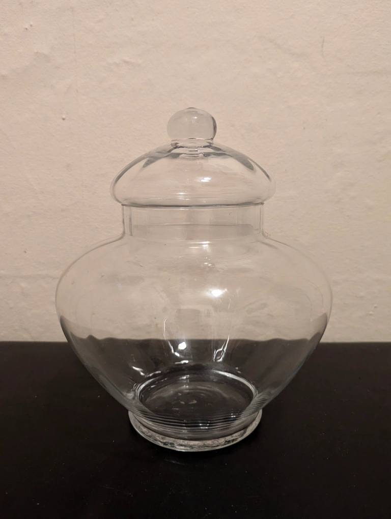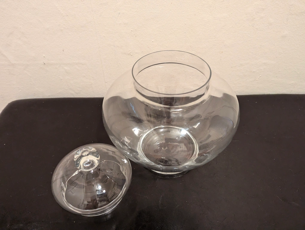 Vintage large apothecary glass storage container with lid. 10.5 inches tall and circumference of the widest part is 26" inches around In excellent condition Pick up in the West End of Vancouver