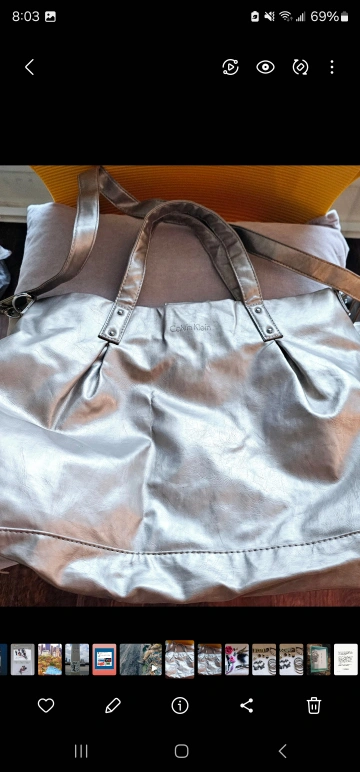 Silver Calvin Klein handbag with a large main compartment and a long strap for shoulder wear.