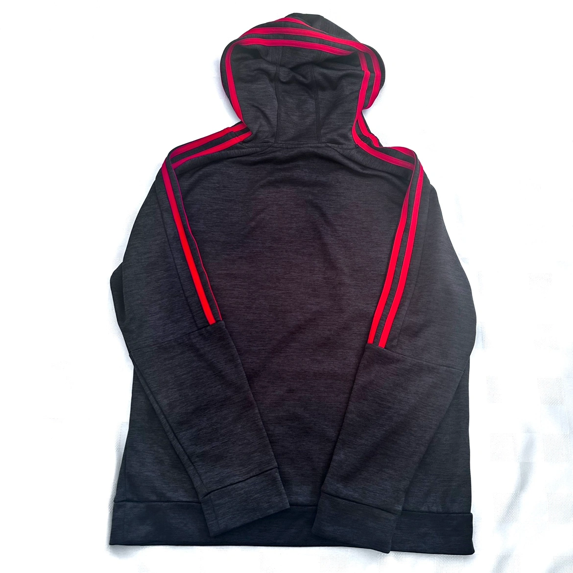 Youth Adidas Hockey hoodie with red stripes and a distressed red logo. The hoodie has a pouch pocket on the front and a hood. PU Brontë & Upper Middle