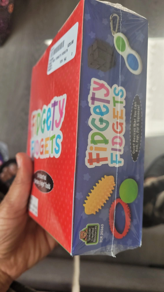 A box of fidget toys that can be rolled, popped, zipped, and squeezed.