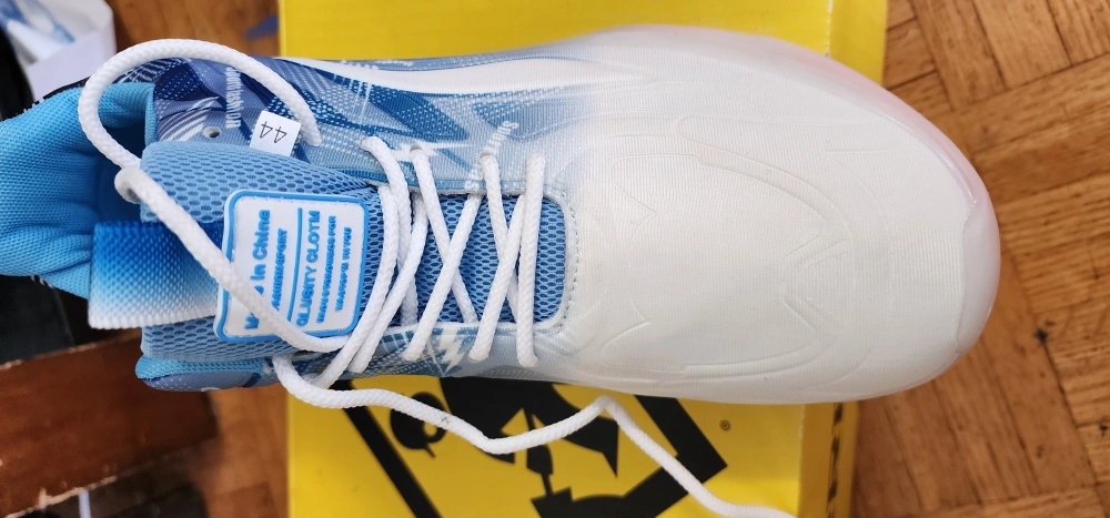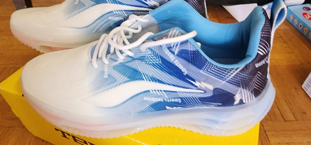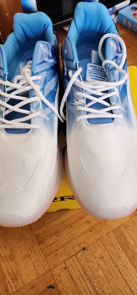 Blue and white running shoes with a clear sole. They are a size 44. They come with a box.