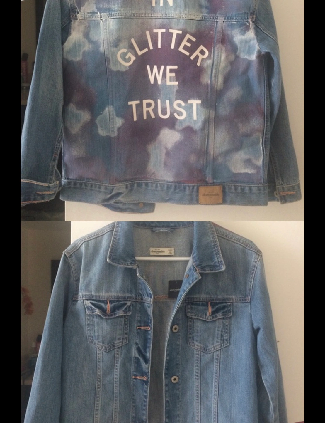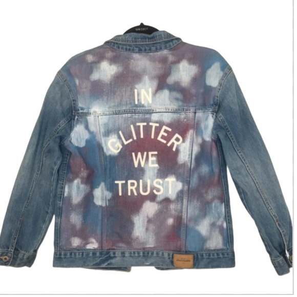 A denim jacket with "In Glitter We Trust" painted on the back in white paint, with a blue and purple cloud background. Size XS