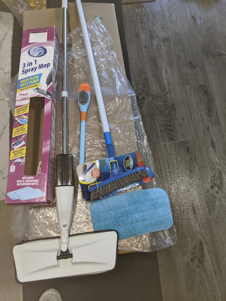 Includes the manual spray mop, new microfiber mitts, and a scrubbing brush. All for 20$ spray mop 15$ mop brush 5$ brush 3$ serious Inquiries only no delivery