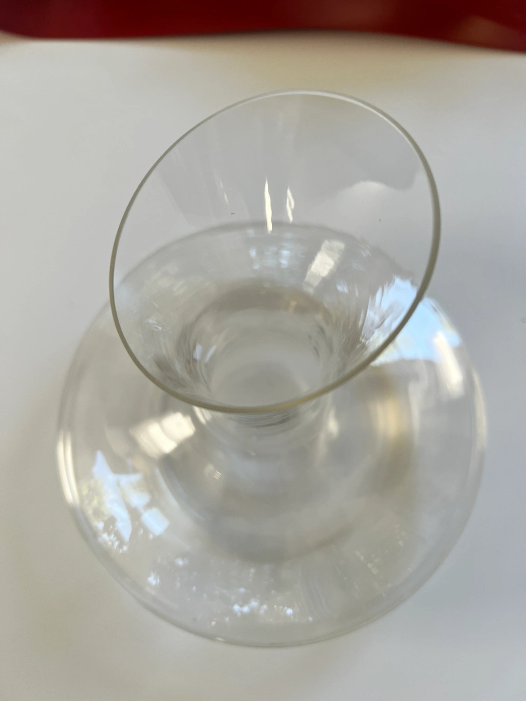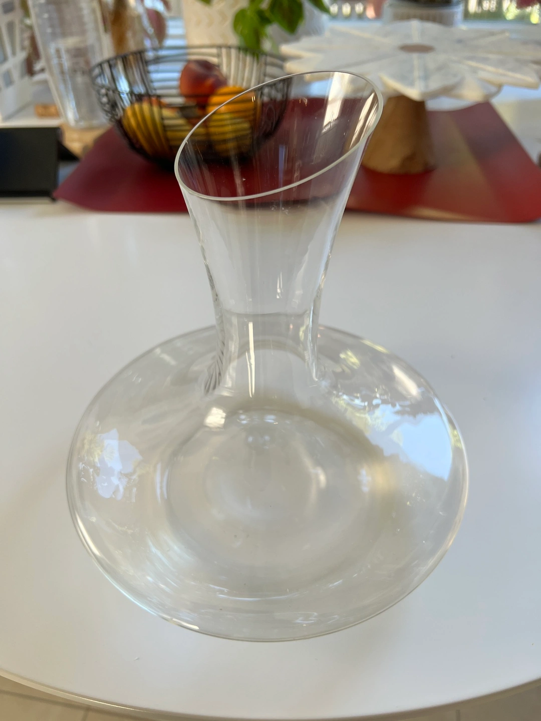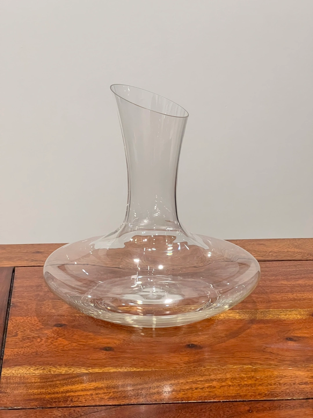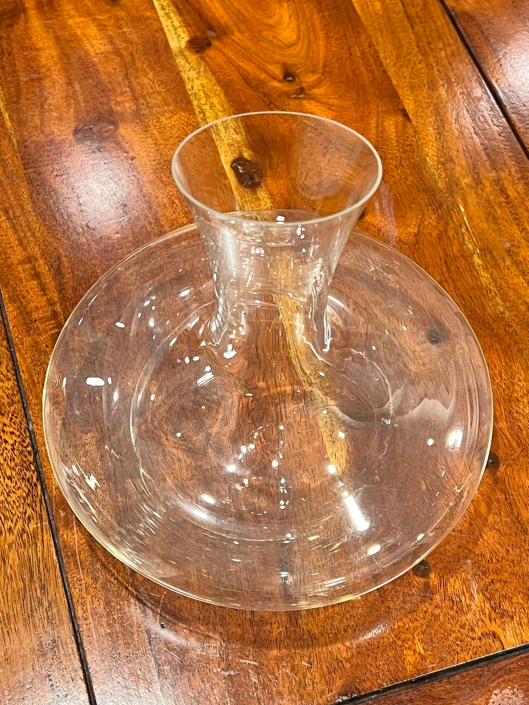 A glass decanter with a wide base. It has a long neck and a spout. The decanter is in the shape of a teardrop. It sits on a wide, flat base.