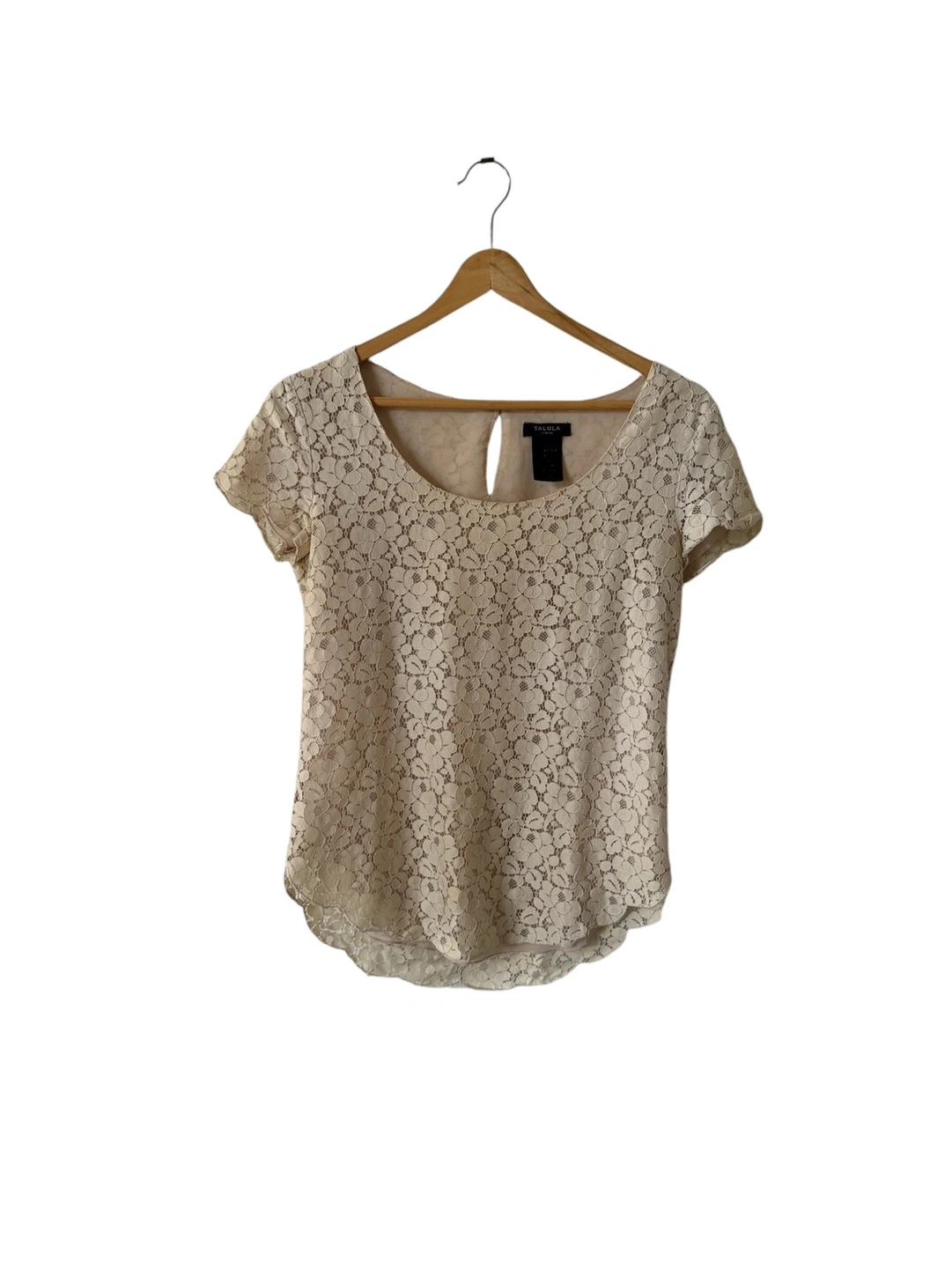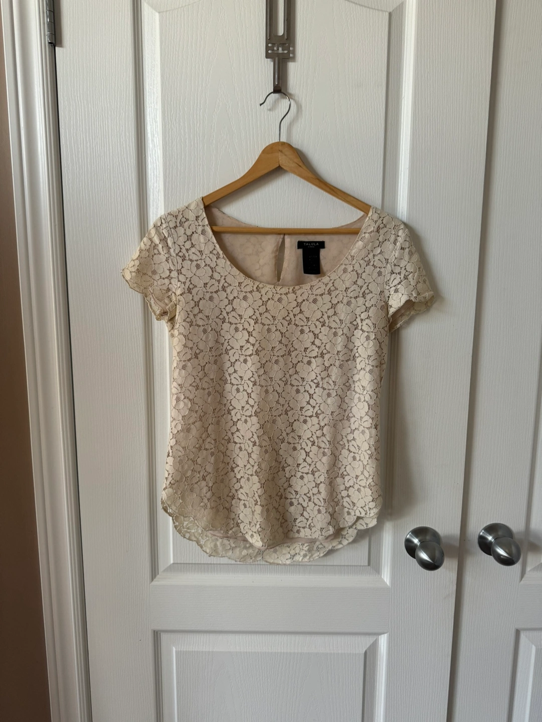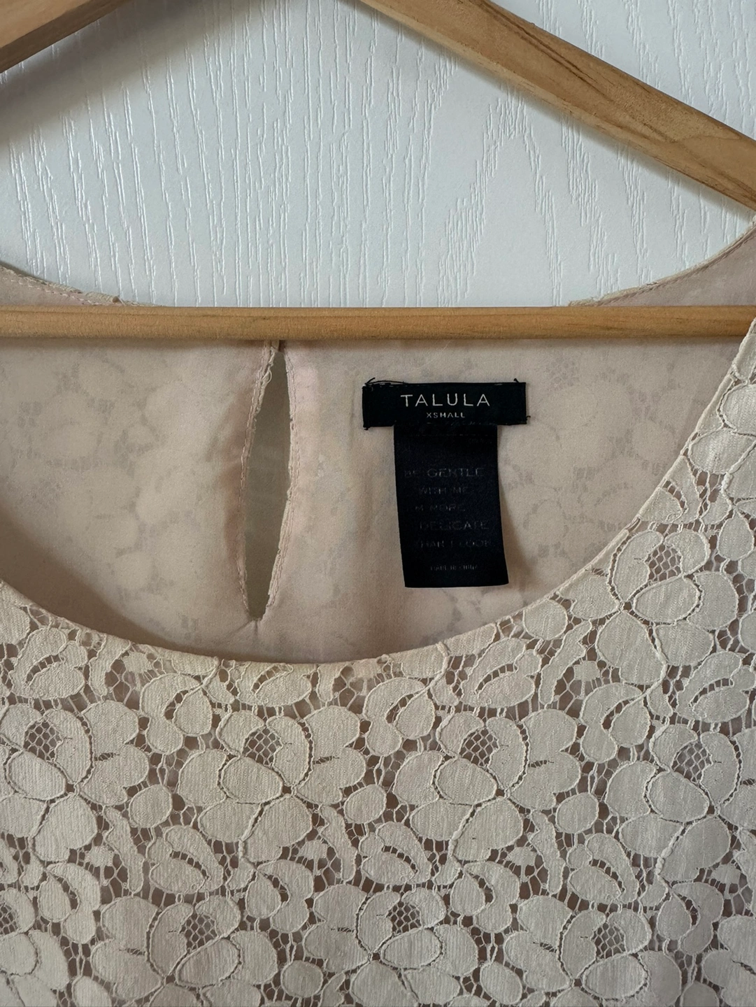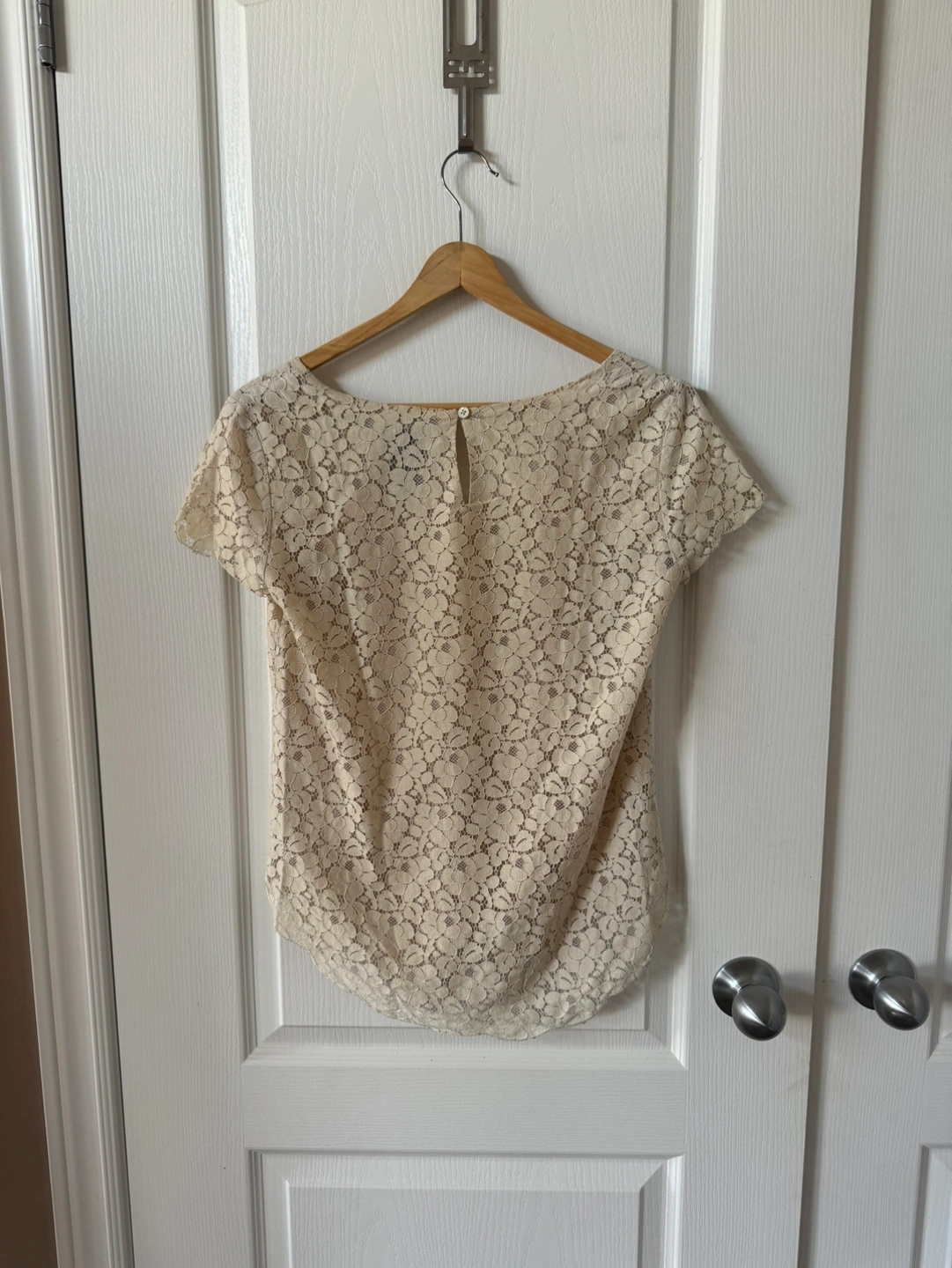 A cream coloured Talula lace top with short sleeves and a keyhole back detail.