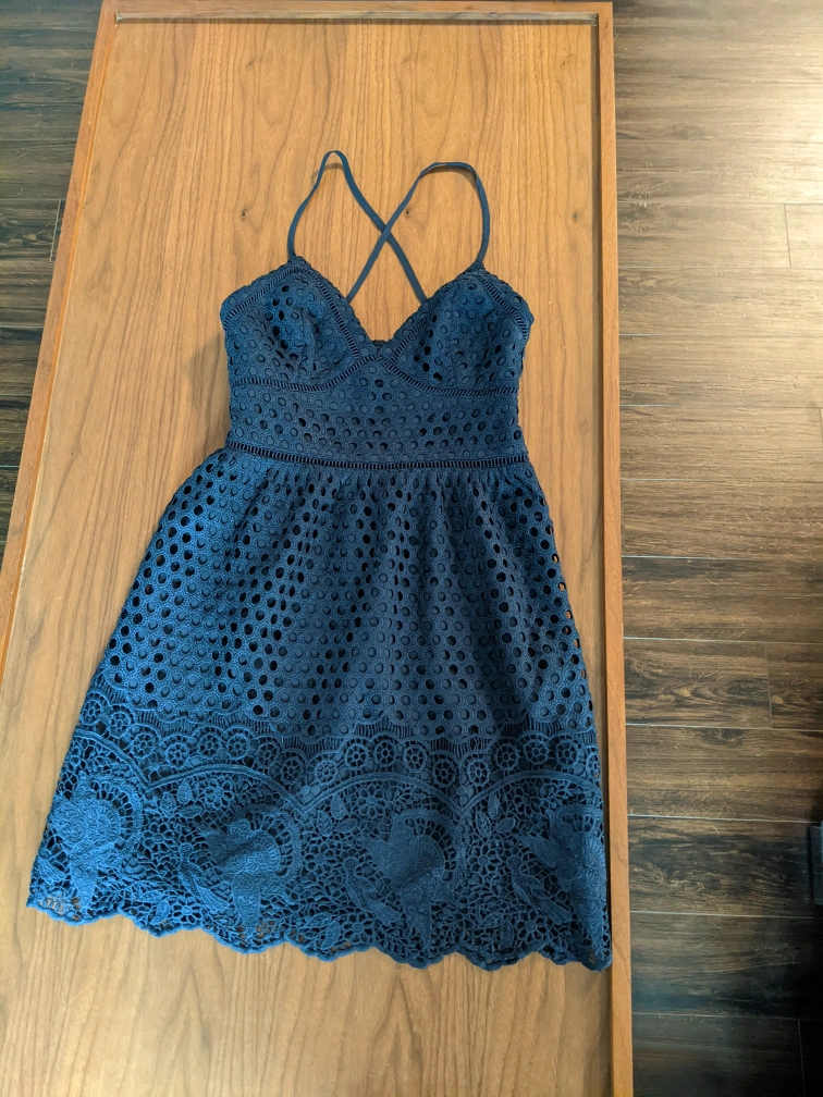 Gorgeous dress with criss cross straps on back, blue lace details, flattering style. worn once and gently washed. laid to dry. pickup downtown near OCAD on McCaul st Toronto tags: dress ladies women girls teen skirt blue navy lace formal semi prom ever holiday party wedding engagement moving sale bundle