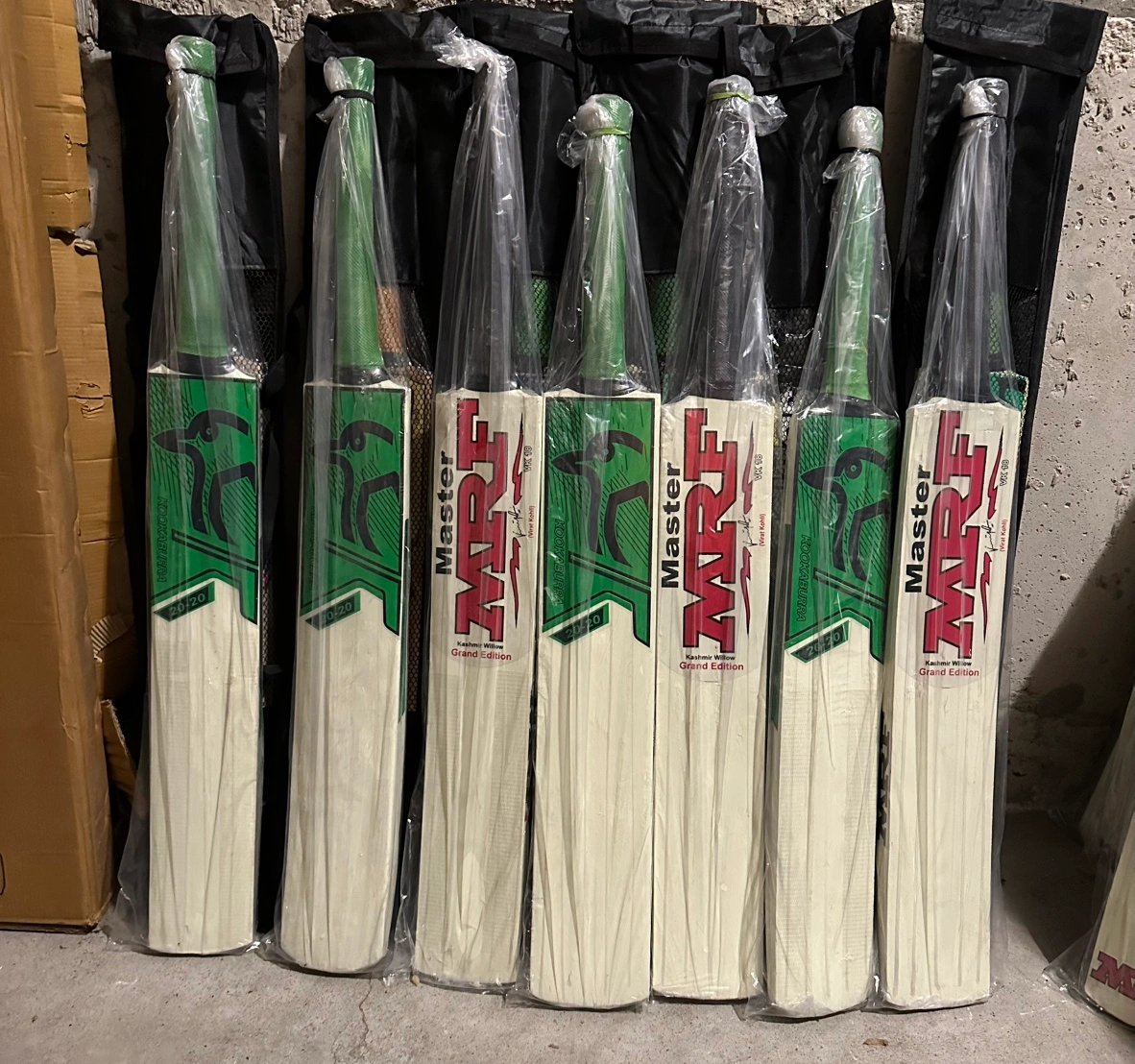 A set of eight cricket bats, including two Genius and six Master Grand Edition. Adults size bats Tennis bats