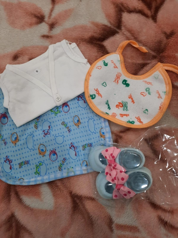 A bundle of baby clothinh, including tops, bottoms, and a hat.