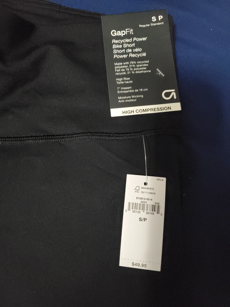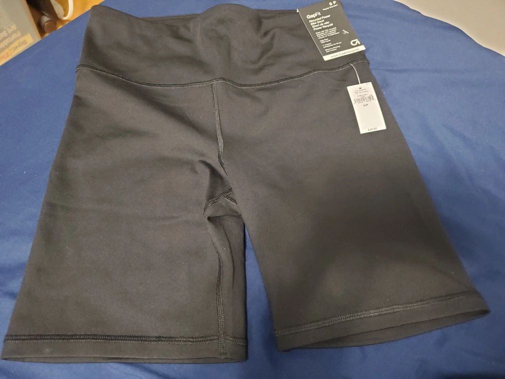 Black bike shorts made from recycled materials. They are size S/P. Meet up at Jane and Alliance and occasionally in Bloor Yonge area