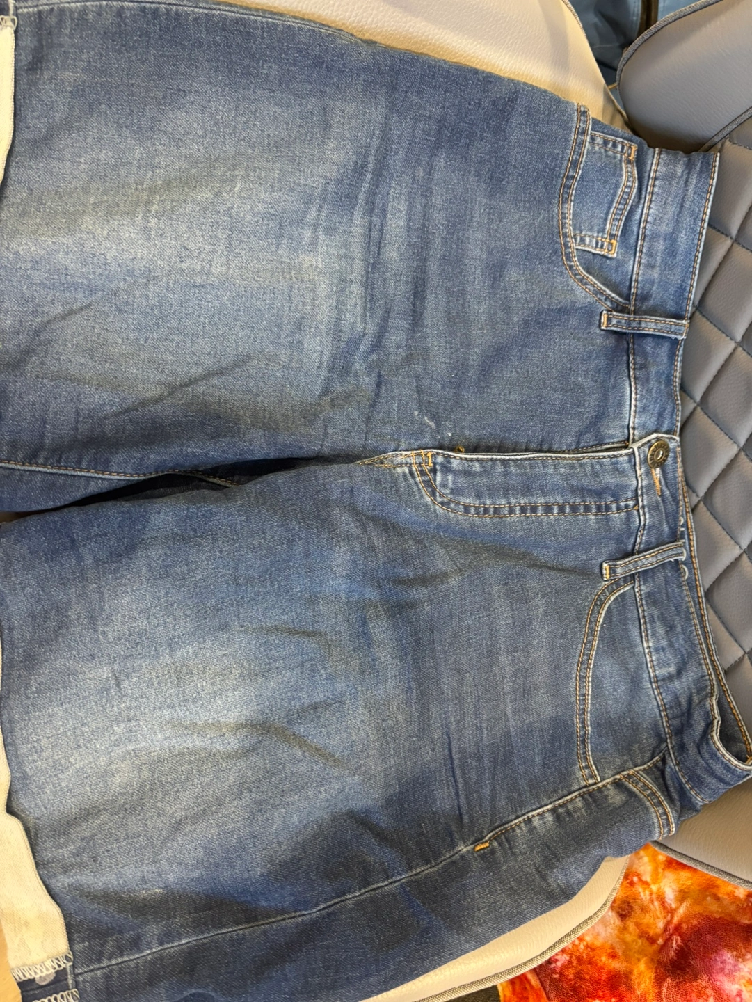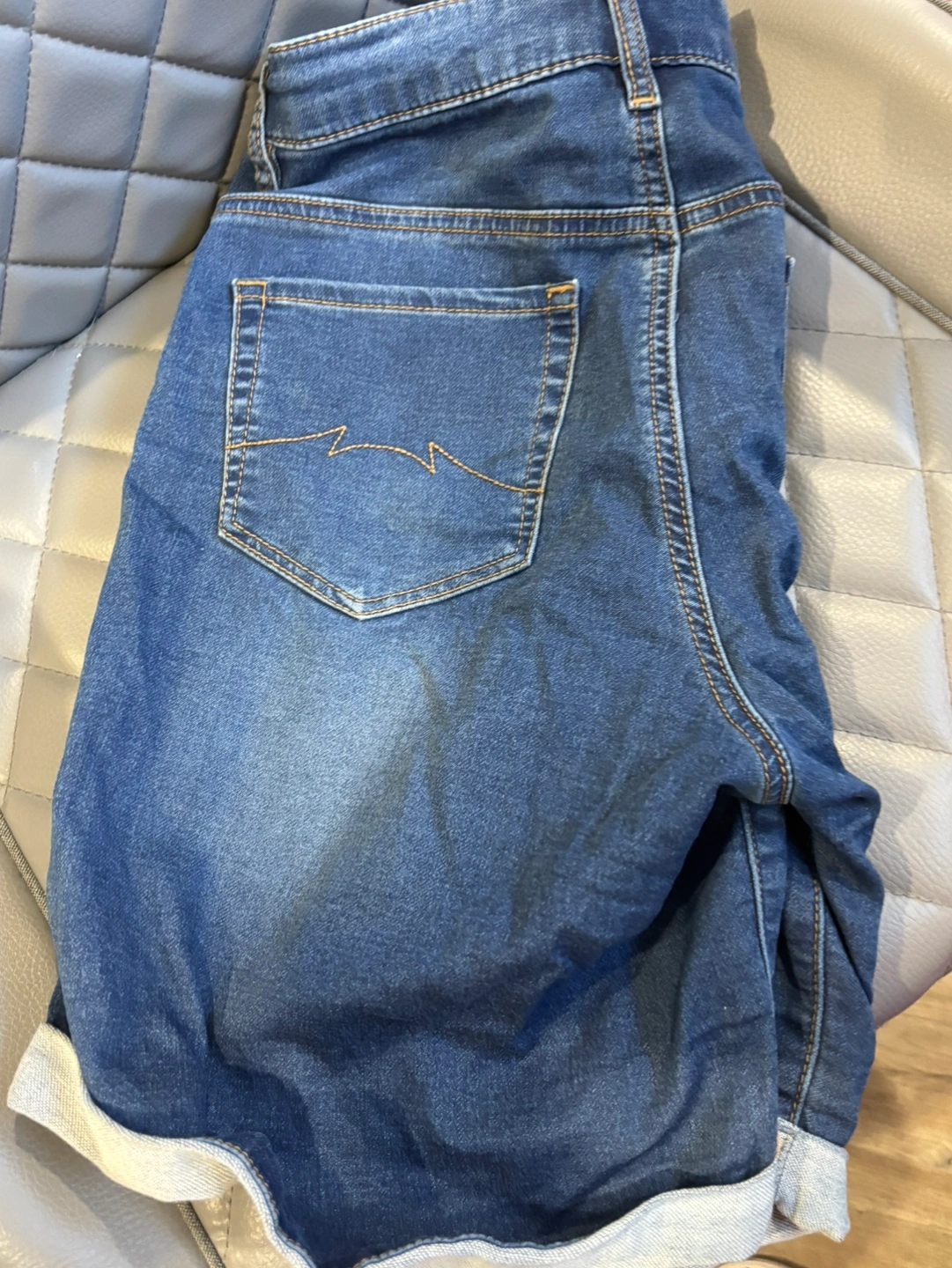 These are a great pair of jeans shorts. They are in a light wash denim with a cuffed hem.