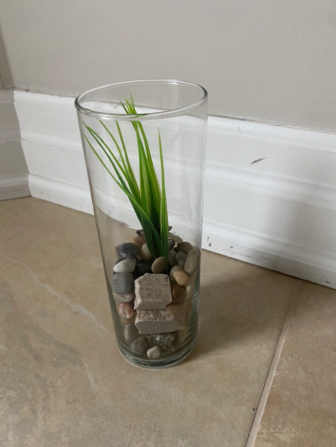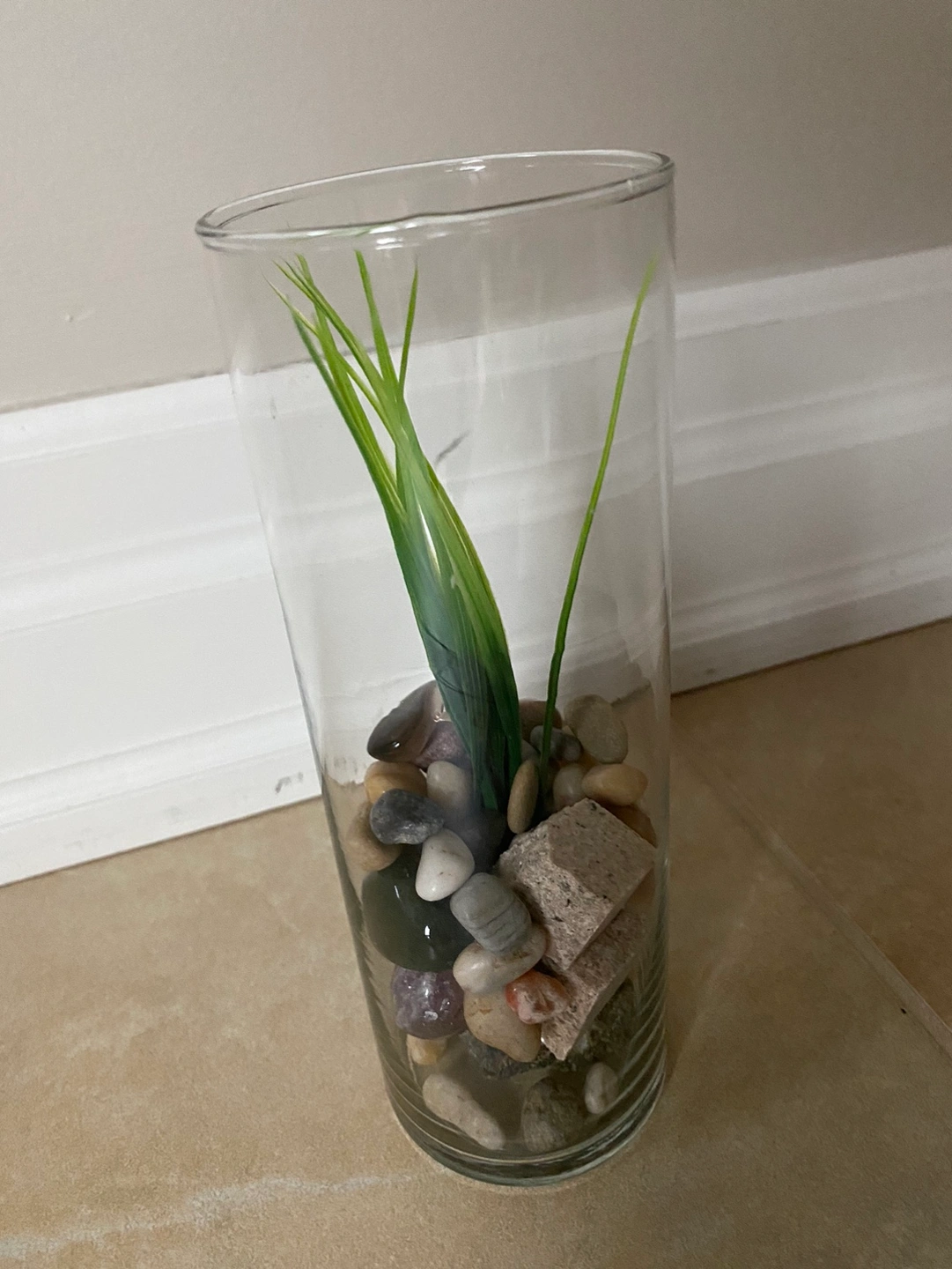 Tall glass vase filled with stones and artificial greenery. 8 inches in height x 3 inches diameter