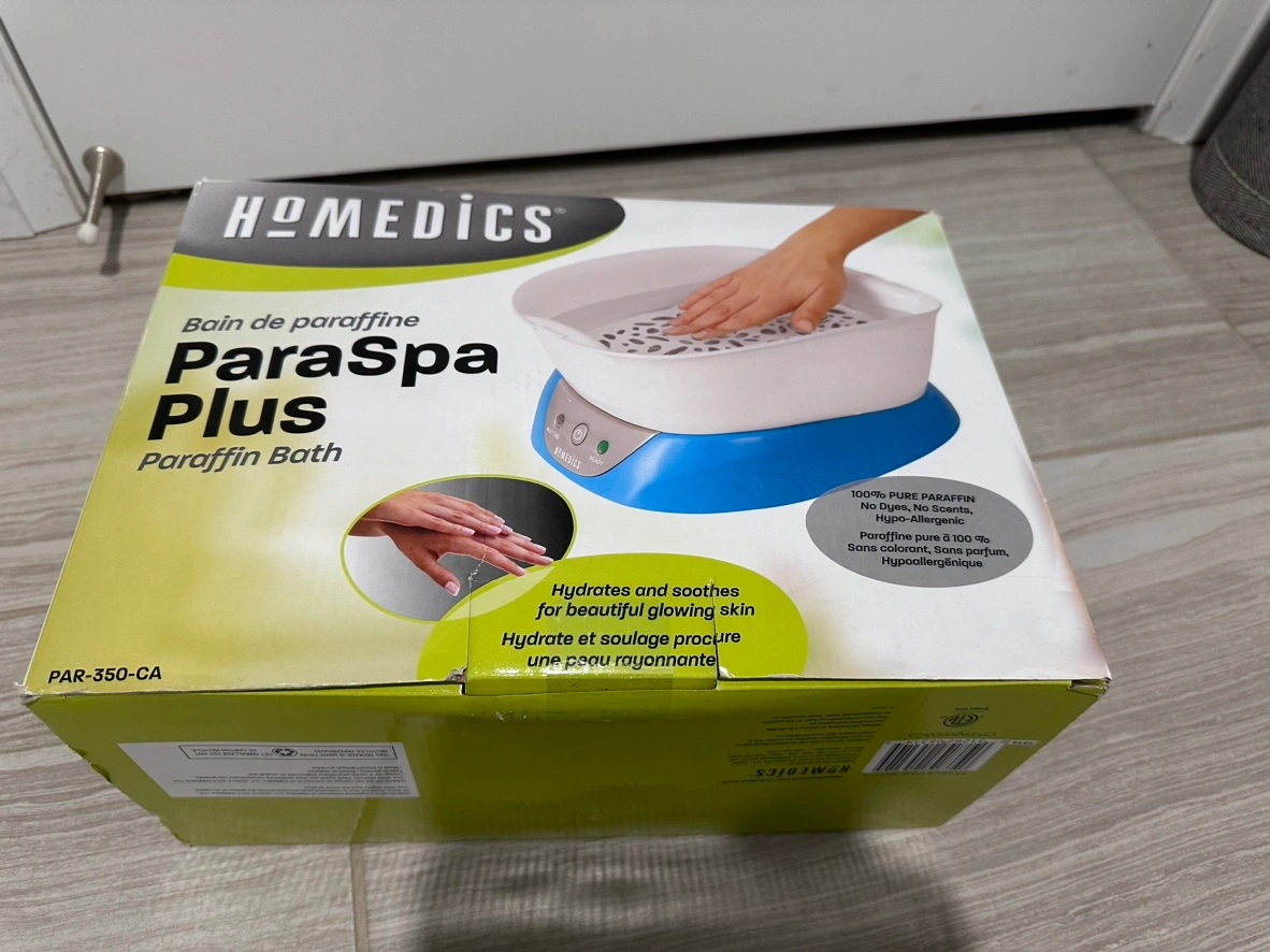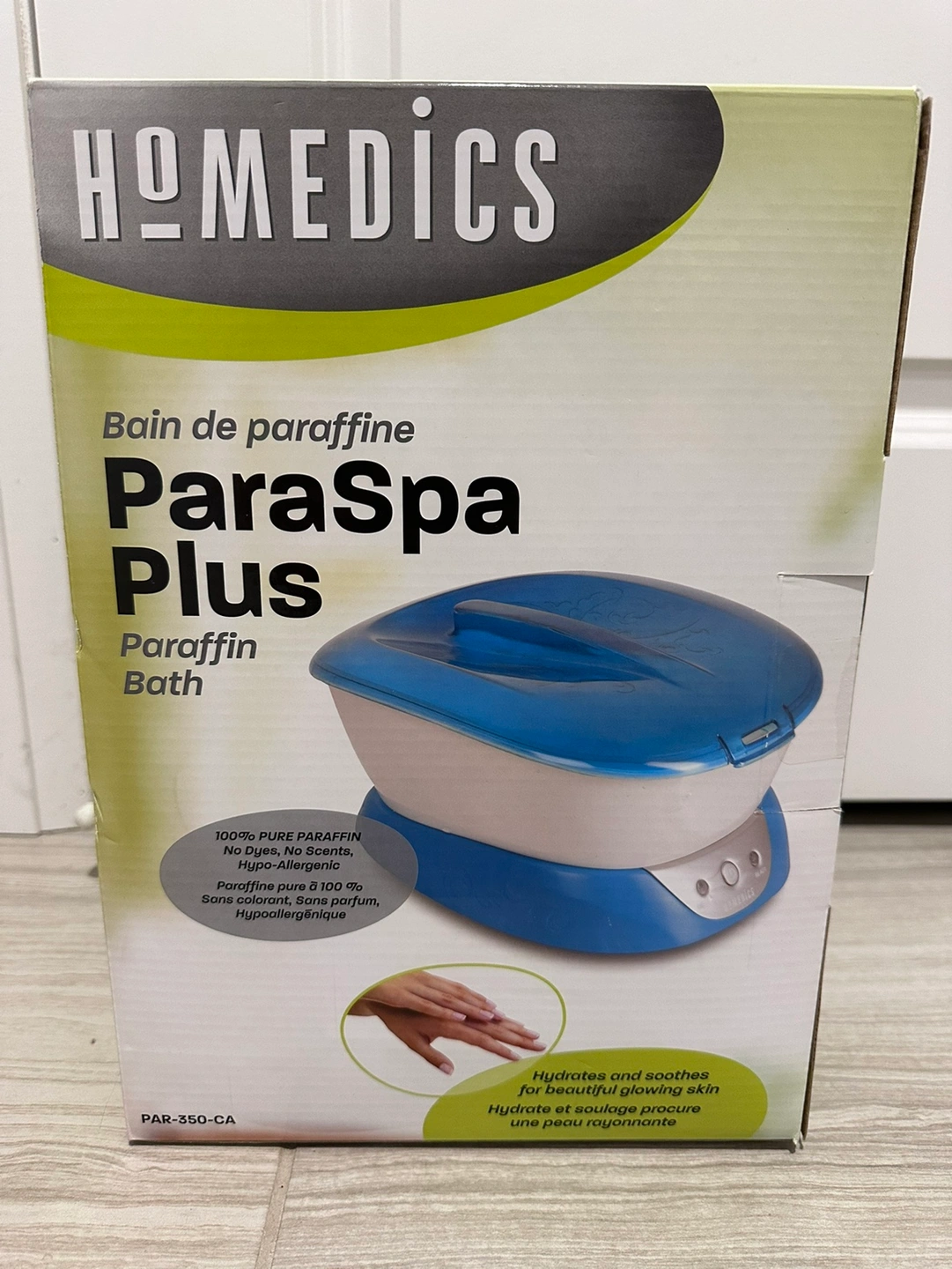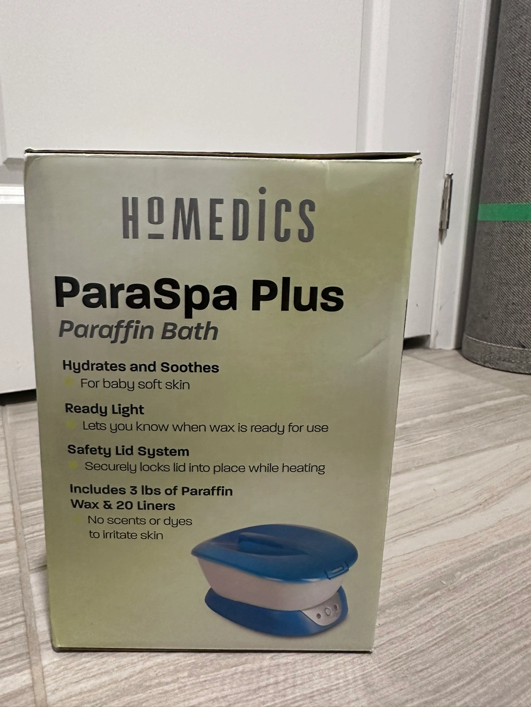 Brand new in box Homedics ParaSpa Plus paraffin bath (PAR-350-CA). Hydrates and soothes for beautiful glowing skin. 100% pure paraffin, no dyes, no scents, hypo-allergenic. - ready light lets you know when wax is ready for use. - safety lid system securely locks lid into place while heating. - includes 3 lbs of paraffin wax and 20 liners.