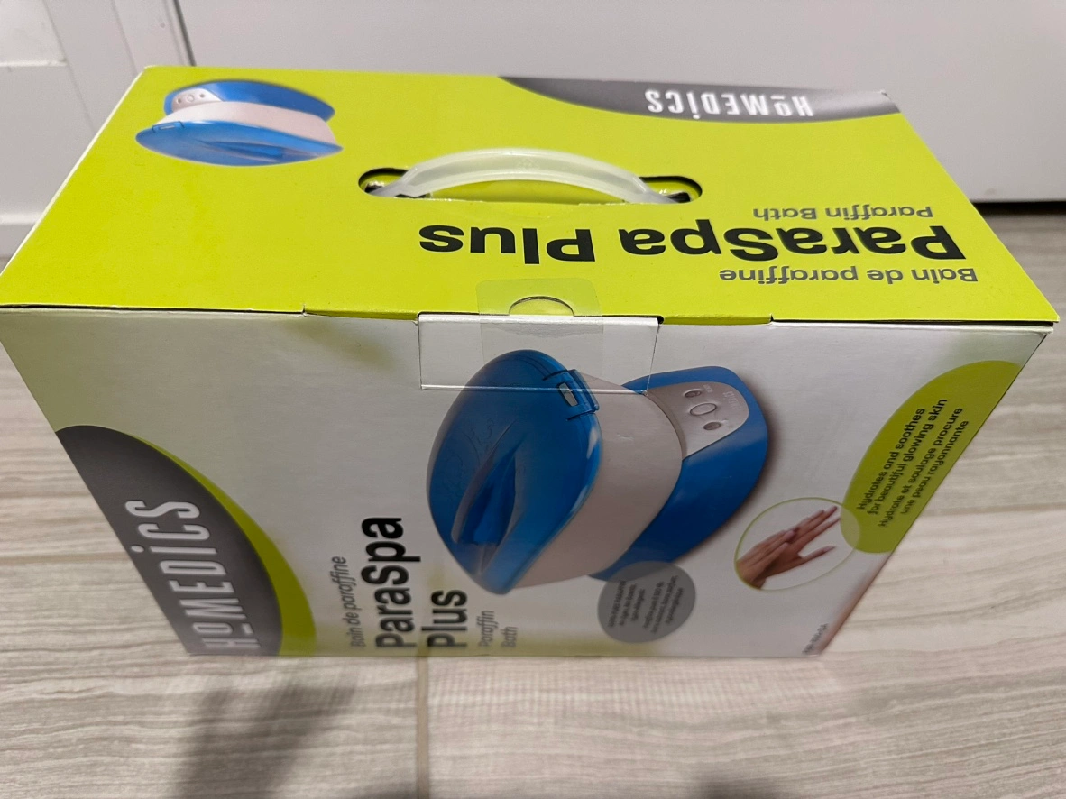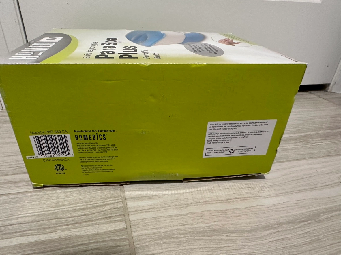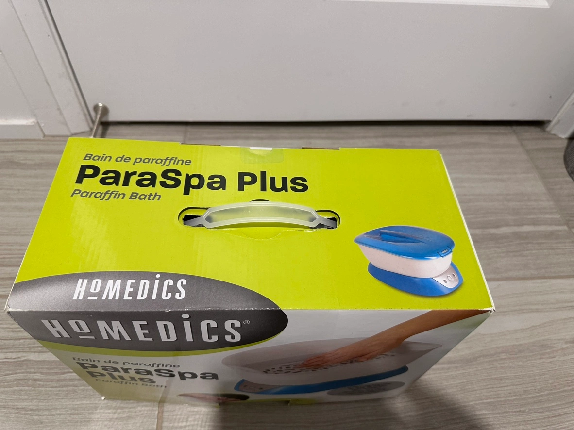 Brand new in box Homedics ParaSpa Plus paraffin bath (PAR-350-CA). Hydrates and soothes for beautiful glowing skin. 100% pure paraffin, no dyes, no scents, hypo-allergenic. - ready light lets you know when wax is ready for use. - safety lid system securely locks lid into place while heating. - includes 3 lbs of paraffin wax and 20 liners.
