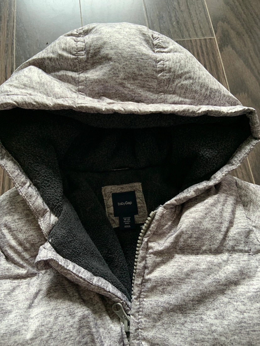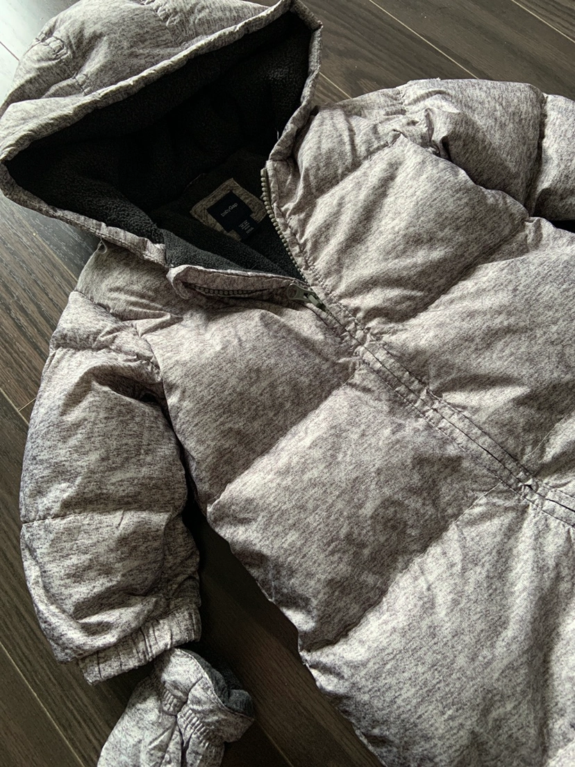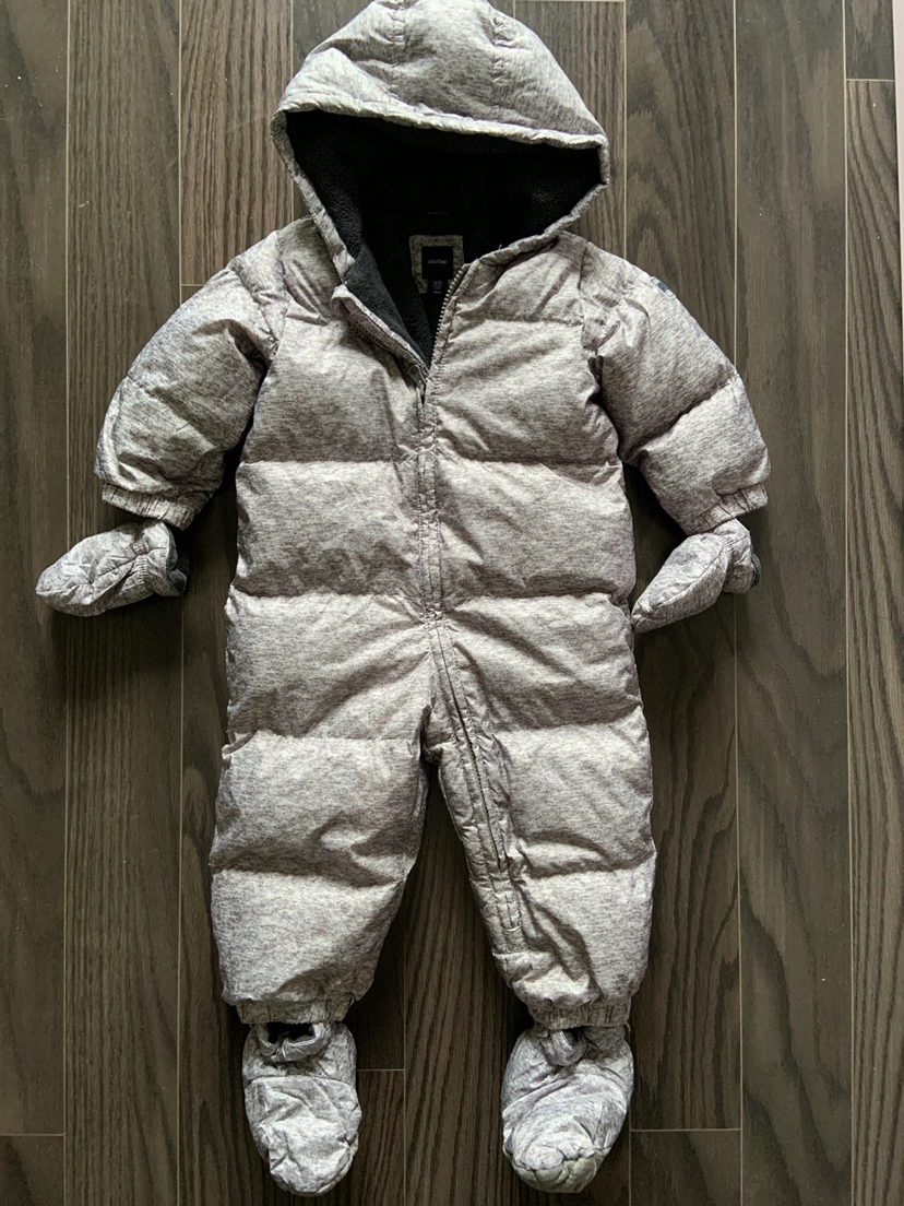Grey snowsuit with attached mittens and booties. The snowsuit is lined with fleece. It is in good condition. Size 18-24M