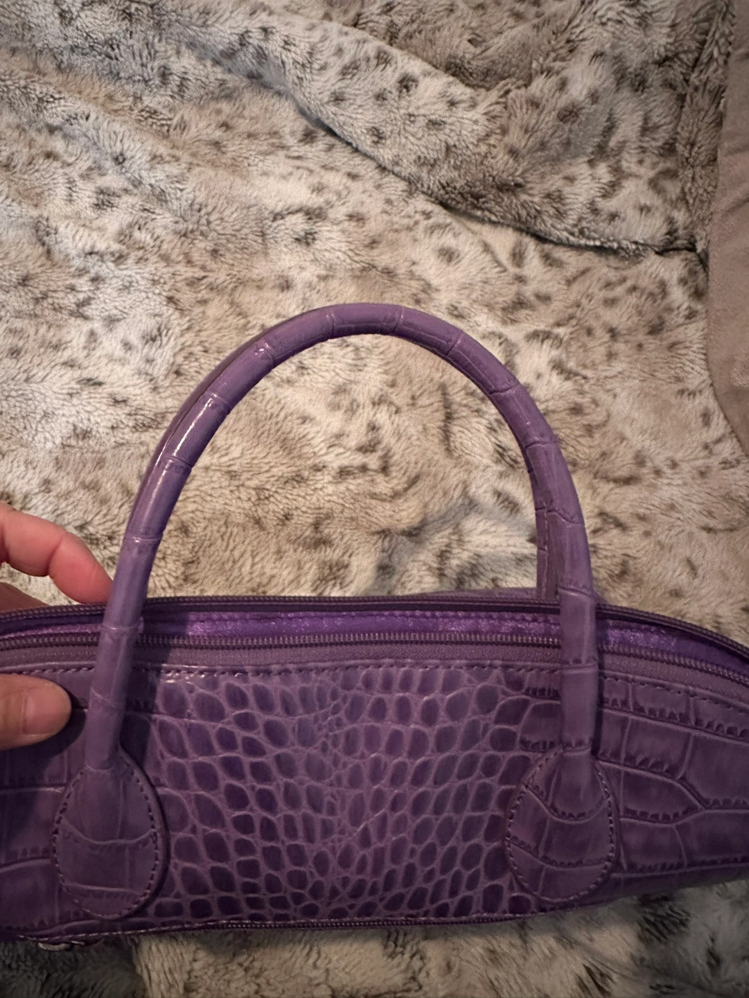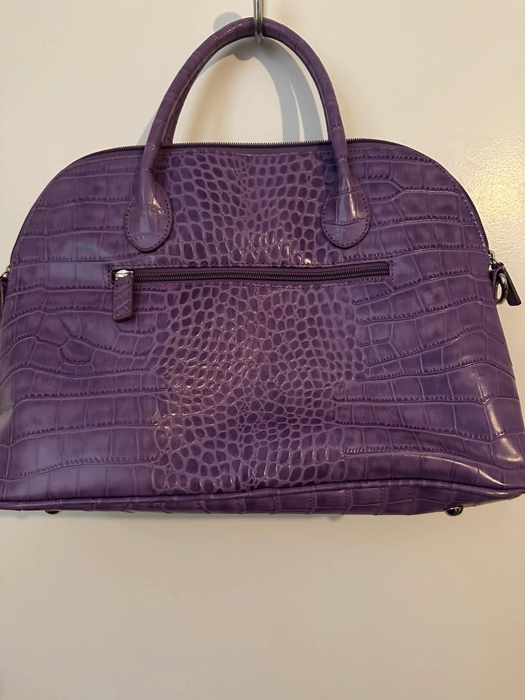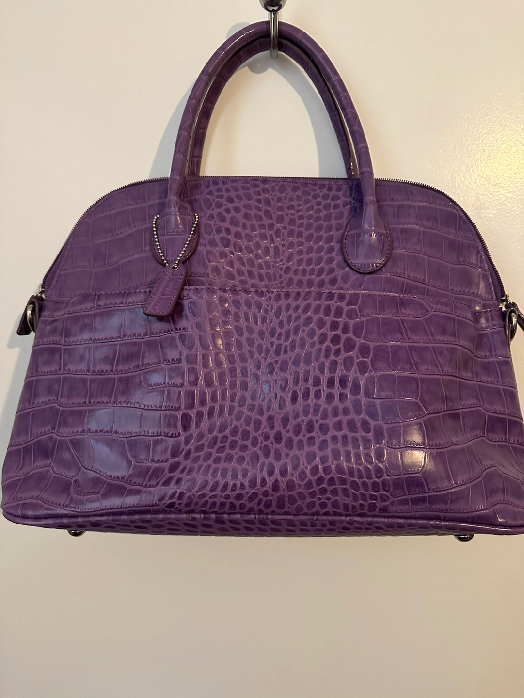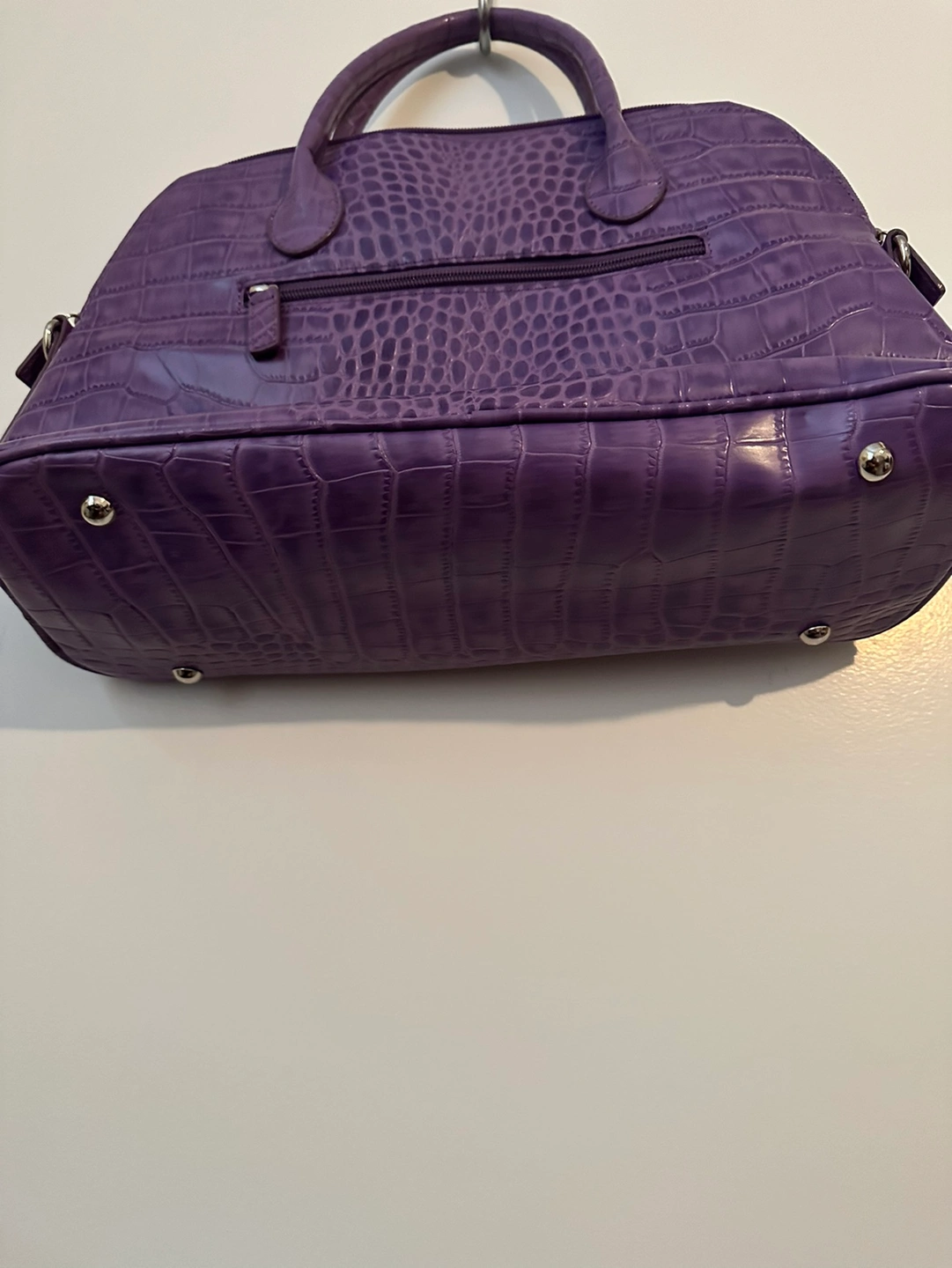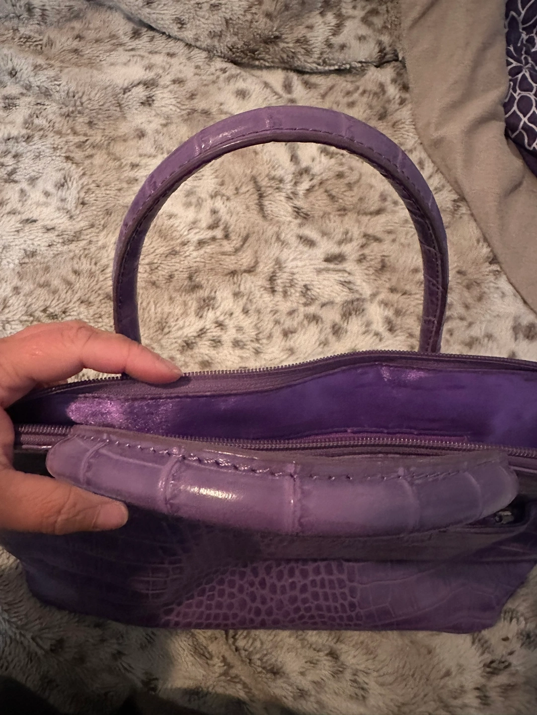 Purple genuine leather handbag with crocodile print. It has two handles and one zippered compartment on the exterior. The interior is lined in purple fabric. It features a zippered pocket and a slip pocket inside. Interior lining is intact no holes or rips and handles are in perfect condition no signs of wear. Shoulder strap included as well as dust bag. Smoke free home.
