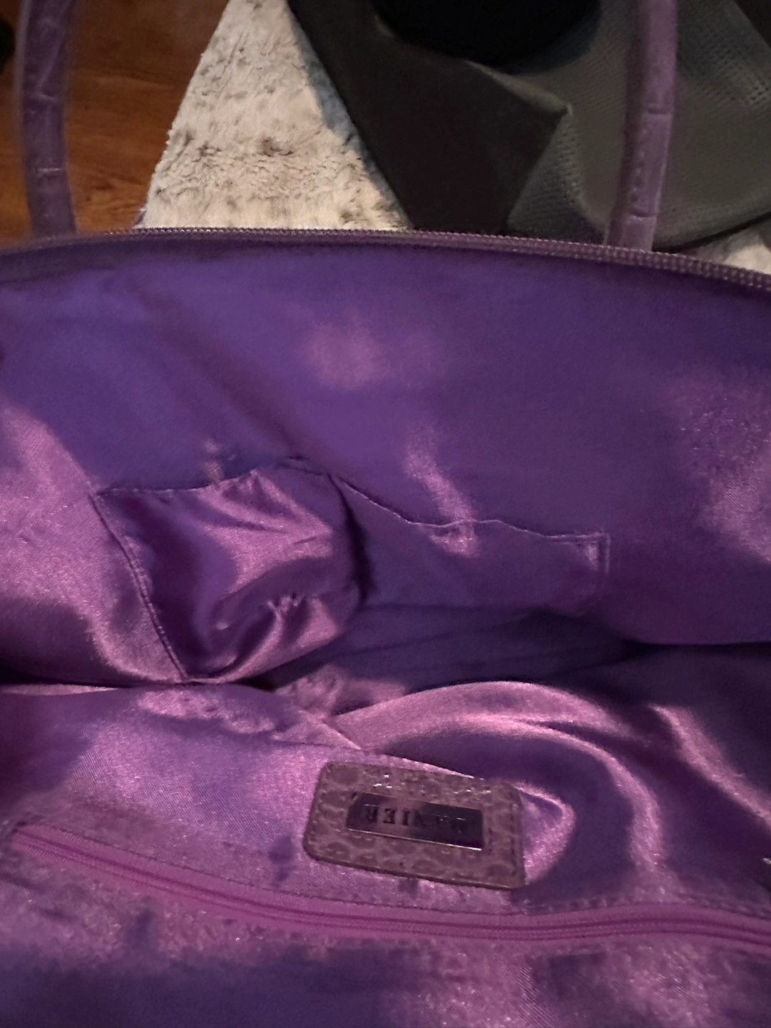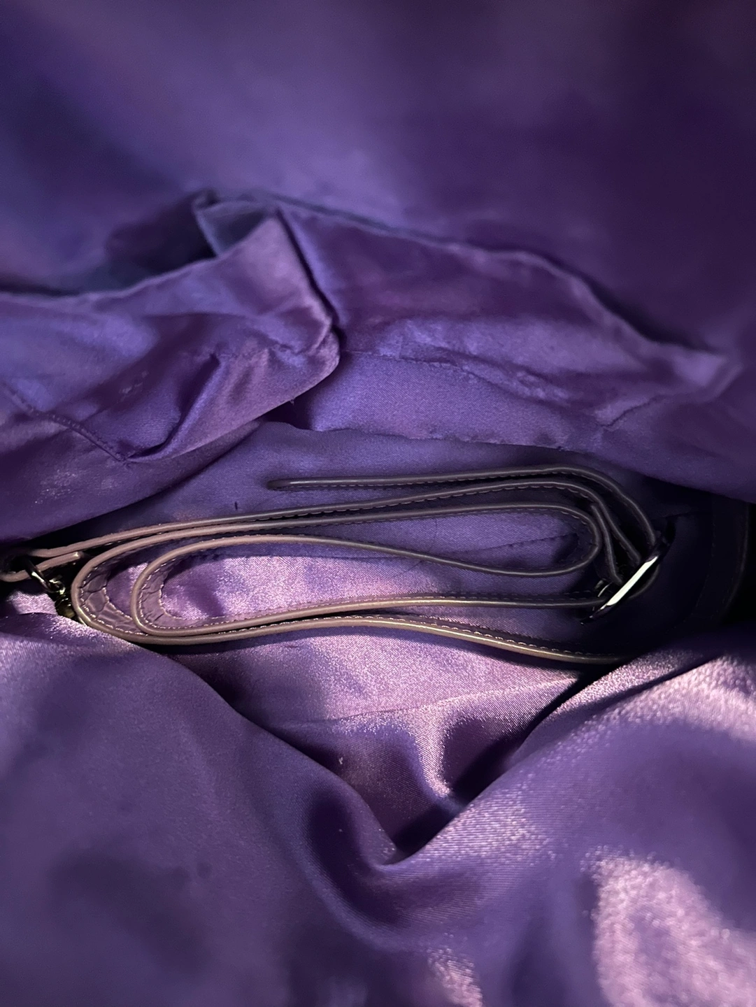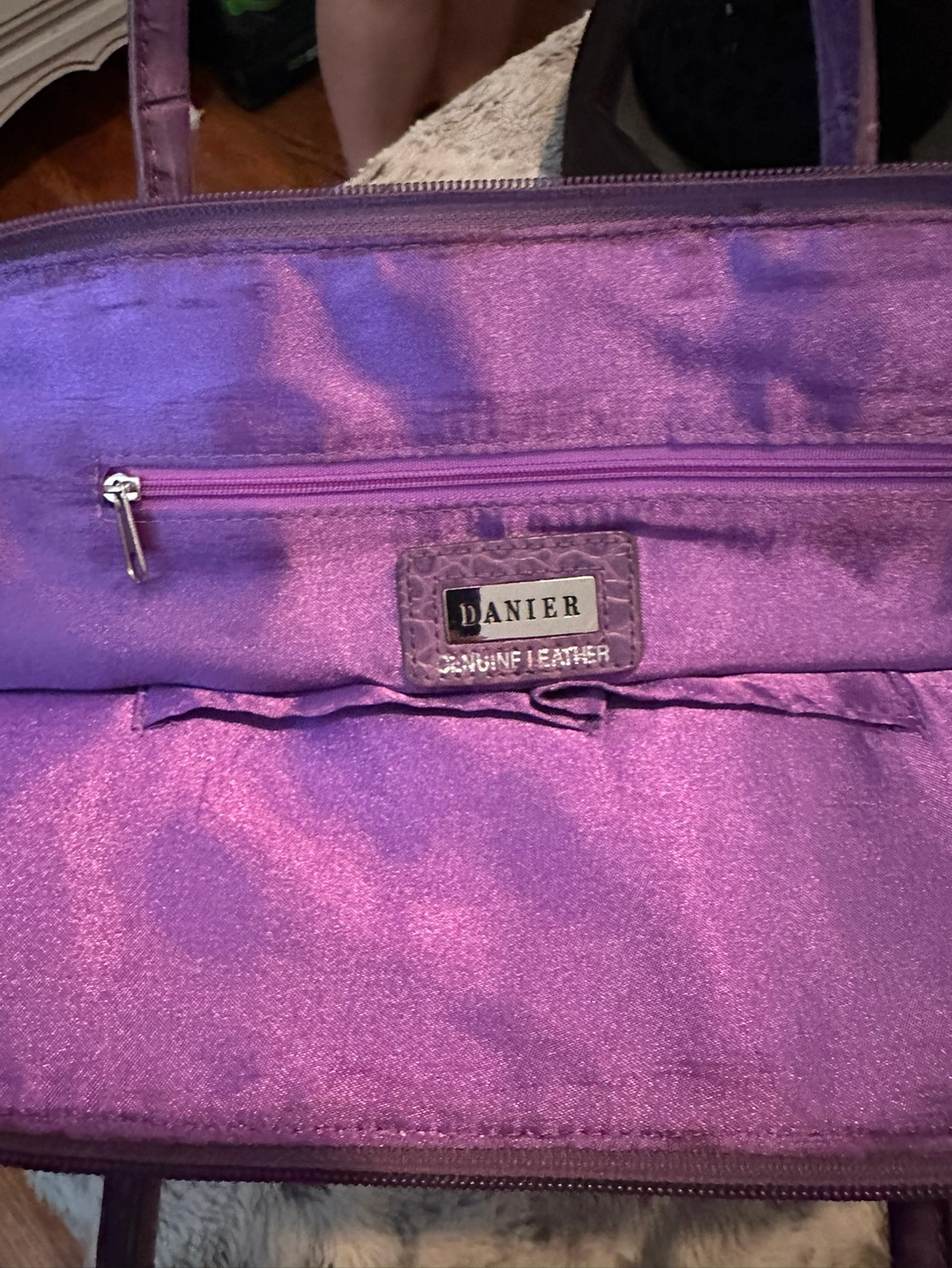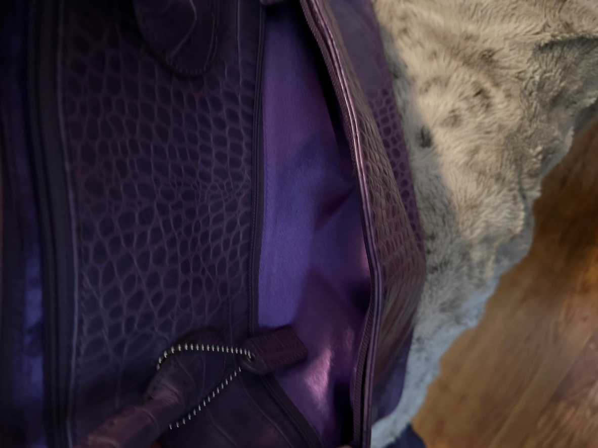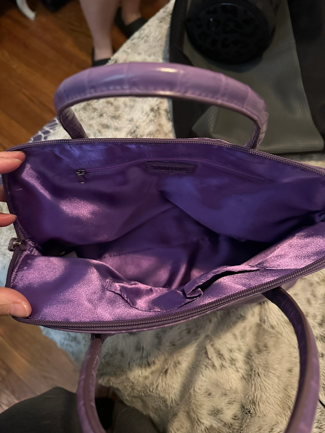Purple genuine leather handbag with crocodile print. It has two handles and one zippered compartment on the exterior. The interior is lined in purple fabric. It features a zippered pocket and a slip pocket inside. Interior lining is intact no holes or rips and handles are in perfect condition no signs of wear. Shoulder strap included as well as dust bag. Smoke free home.