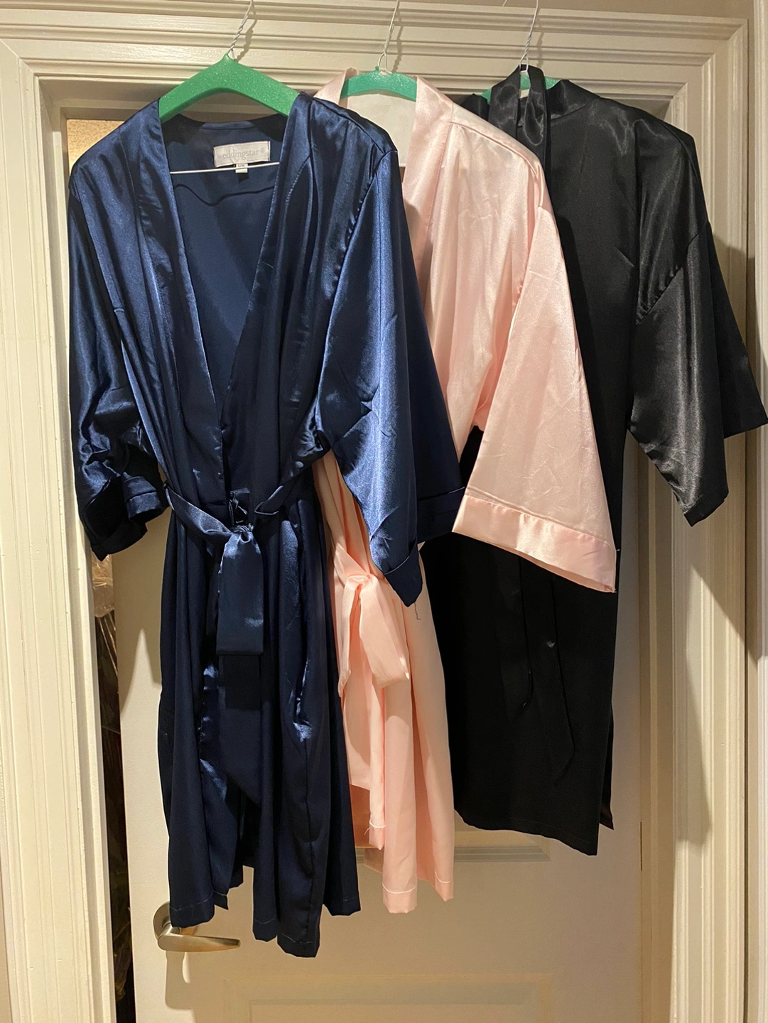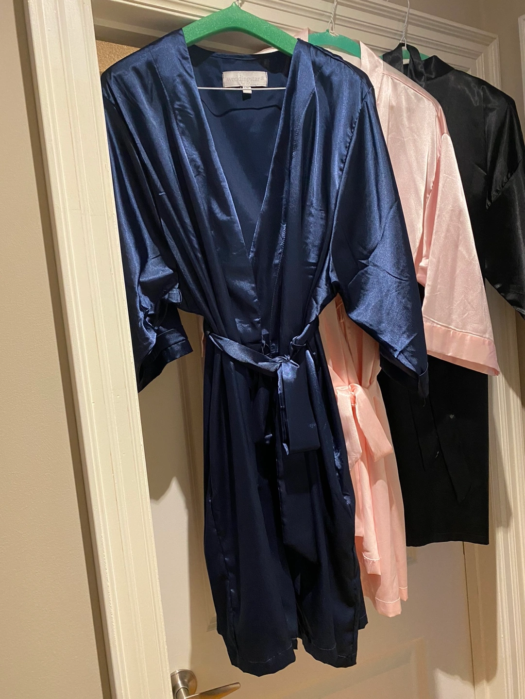 Set of 3 robes in navy, pink, and black. The robes are satin and have a tie belt. $10.00 each only worn once and then had it professionally cleaned. I have 1 left Navy Blue
