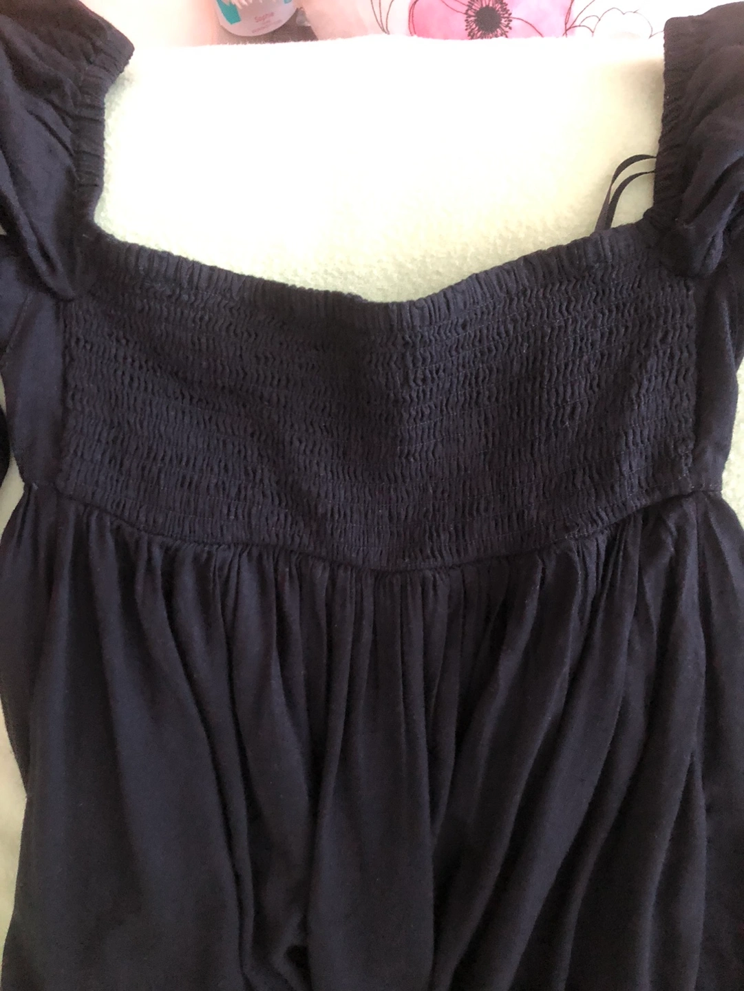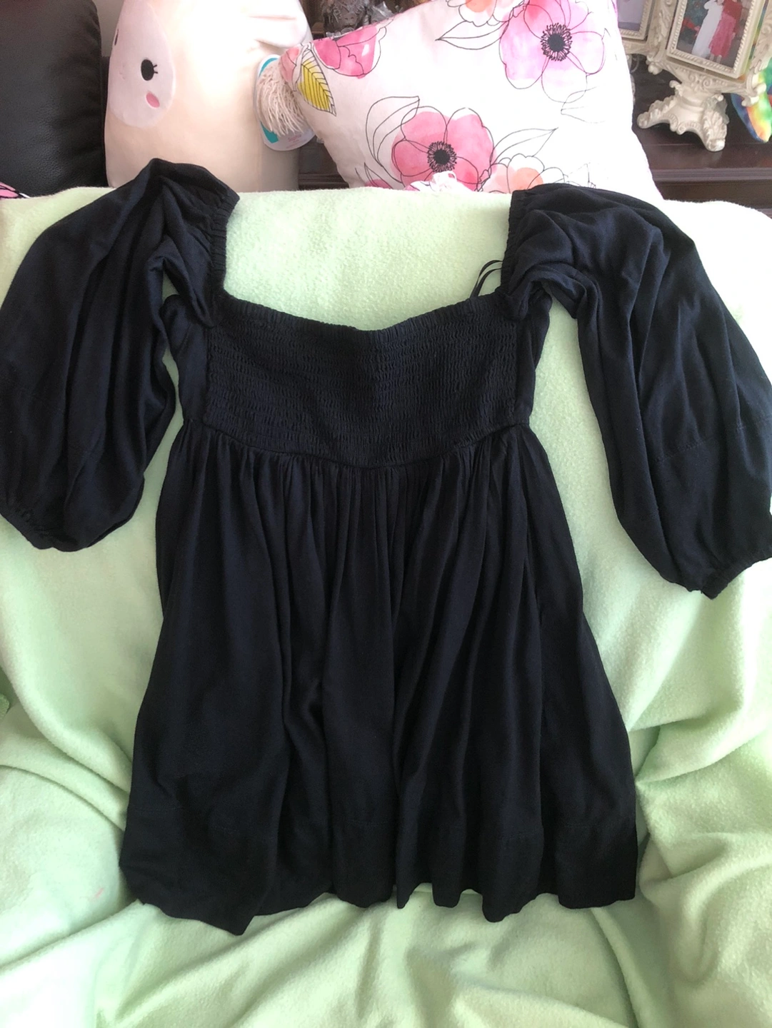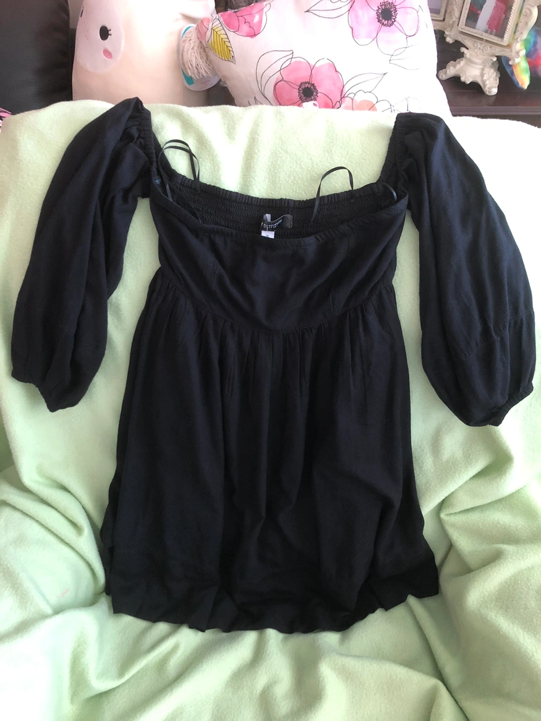 Cute off the shoulder top with long balloon sleeves and a smocked bodice. This top has pockets!