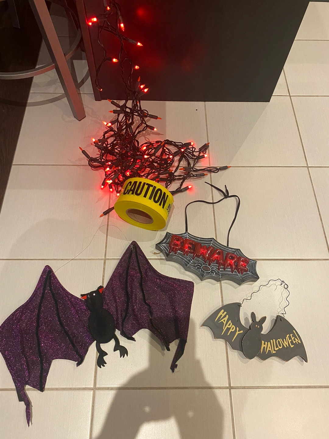 Lot of 5 items 1- Brand New - Caution Tape Roll - XL Super thick roll 1- Beware Sign (Creepy Musical light up door decor with button) 1- Bat hanging decor 1- Happy Halloween Sign 1- Orange String of lights