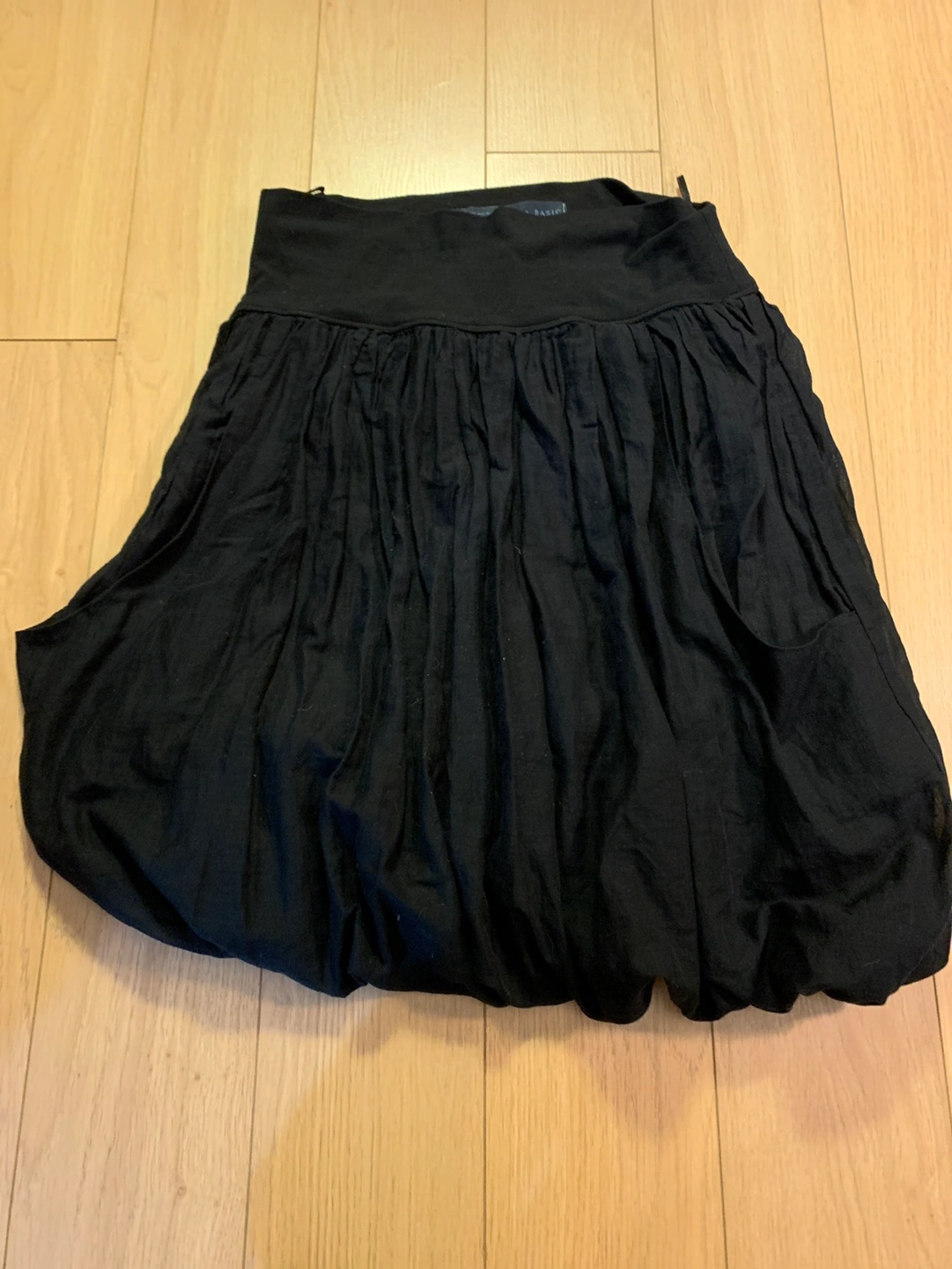 A black skirt with a gathered waist and a loose, flowy fit. Throw on with tights to look awesome for fall/winter
