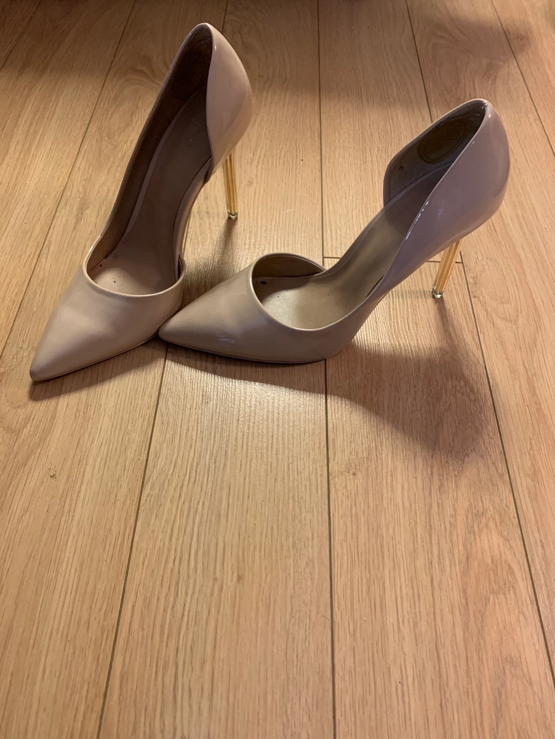 Pointed nude heels with gold stiletto heel. Patent leather. Wore once for a wedding.