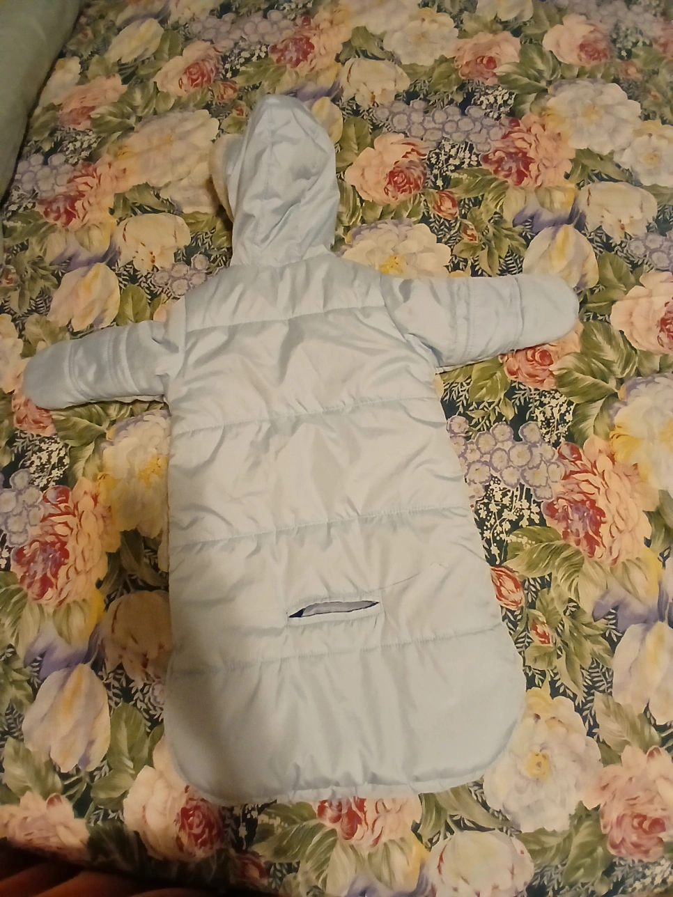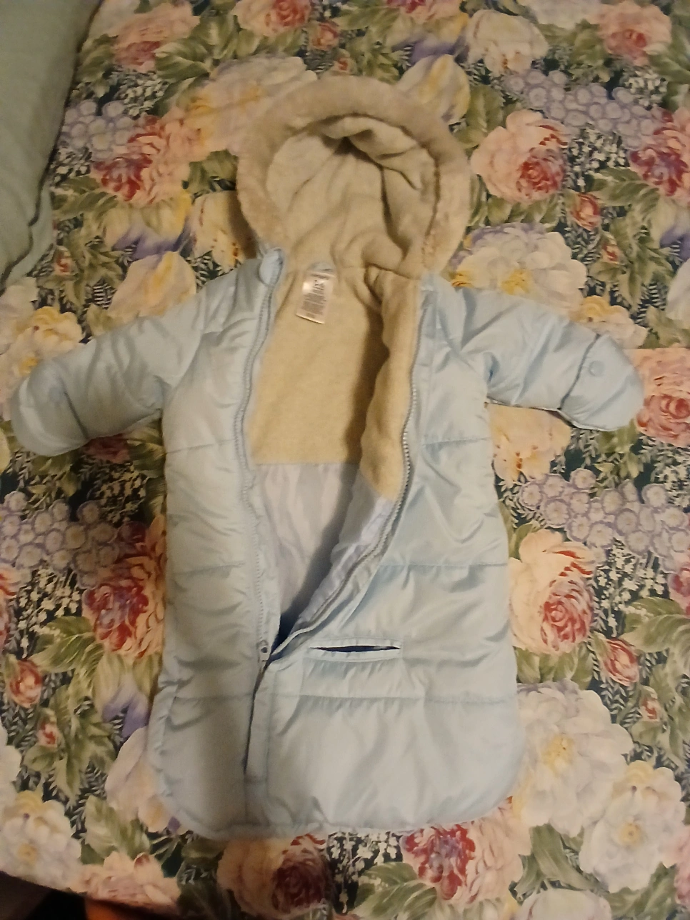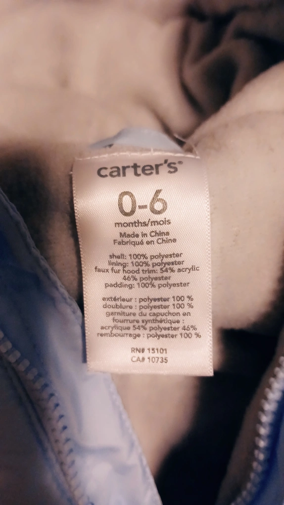 Carters blue baby snowsuit in size 0-6 months. It has a hood with a faux fur lining. The snowsuit is padded and has a zipper down the front. There is a pocket on the back. Baby can use it un the carseat and the stroller in winter. Pick up, cash only, no delivery.