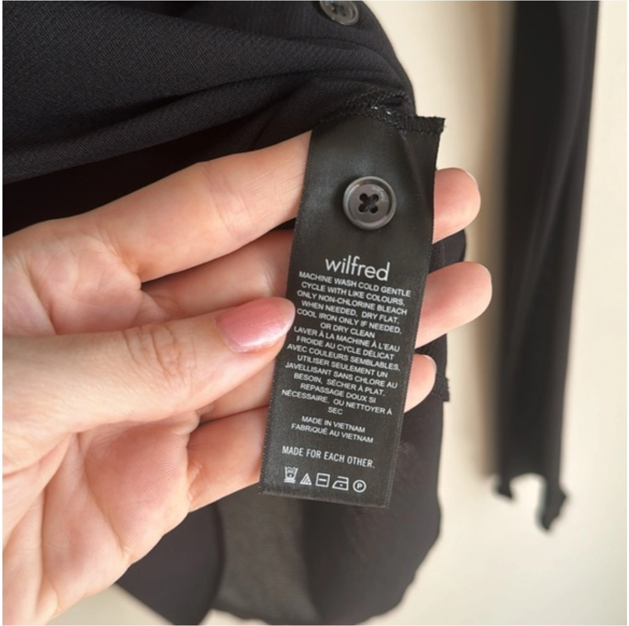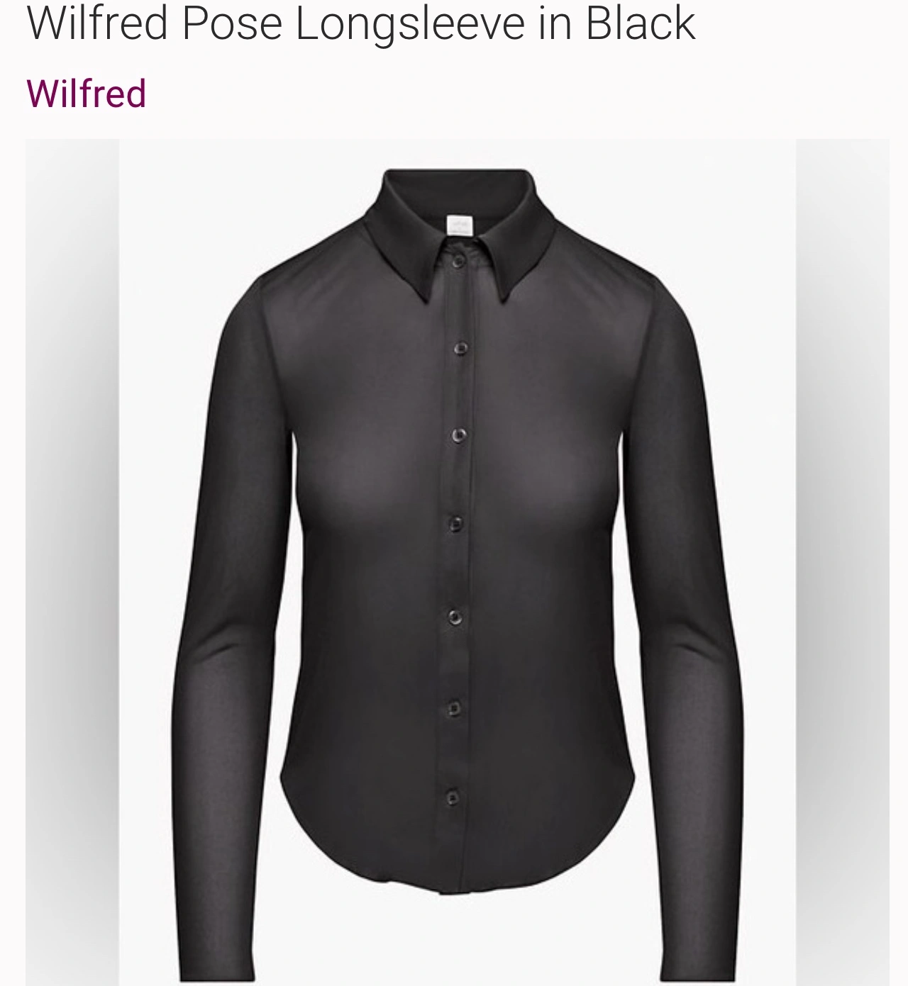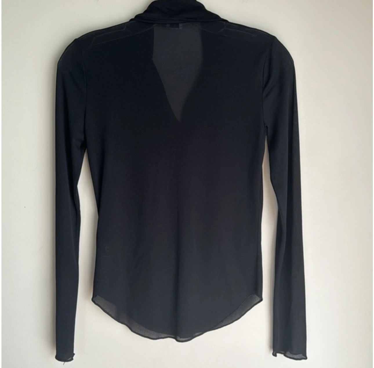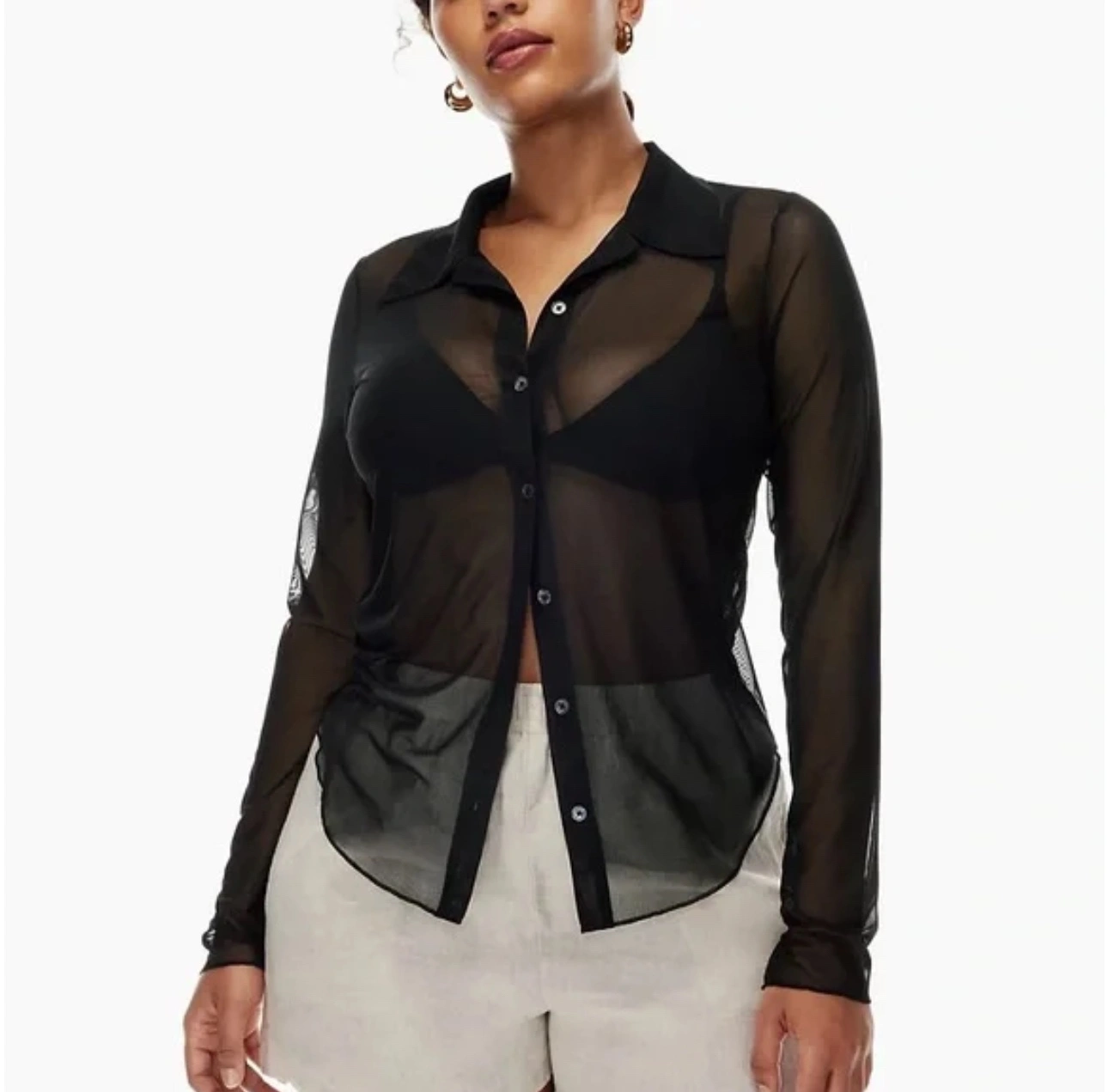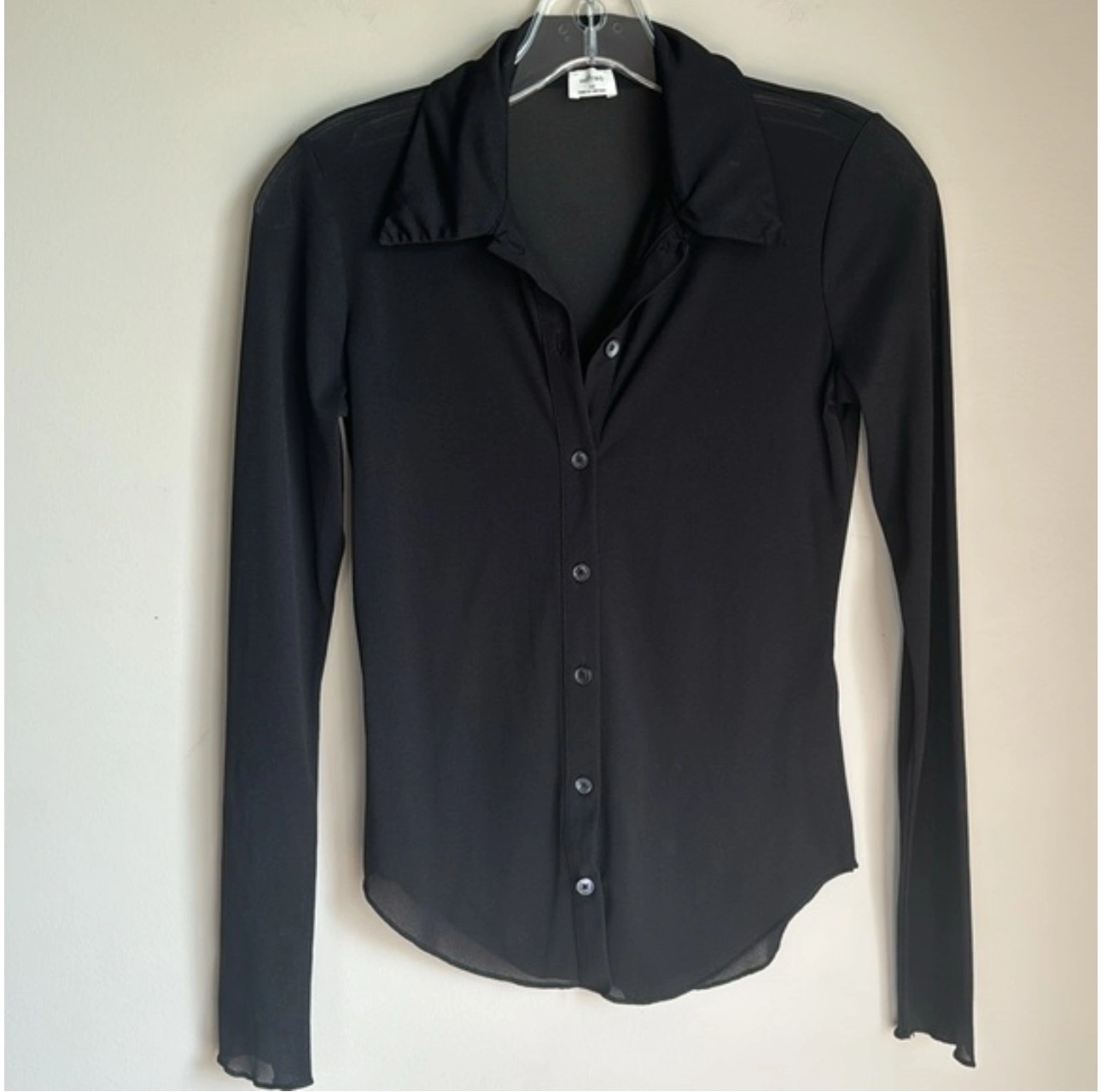 Size XS Like new- used maybe twice Black sheer long sleeve button down shirt with a collared neckline. Made from a thin, lightweight fabric with a slightly stretchy feel. The shirt has a fitted silhouette that hugs the body and features a curved hemline. The sleeves are long and have a slightly gathered detail at the cuffs. It is perfect for layering or wearing on its own.