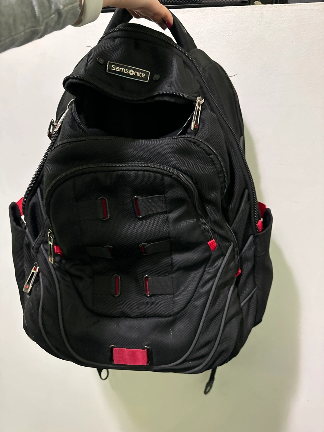 Black backpack with red accents. A rip in one of the sides, can easily be fixed