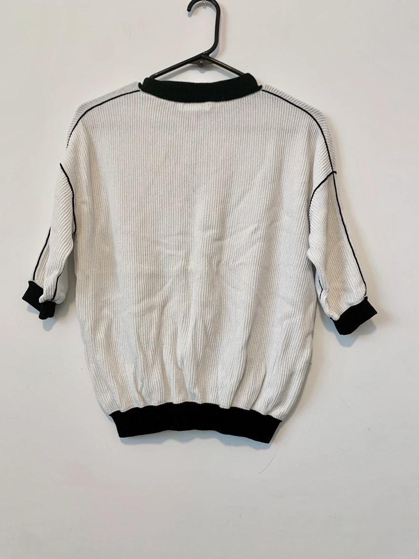 A white sweater with black trim. It has a ribbed texture. The sleeves are 3/4 length. It has a crew neckline. Selling this because I don’t fit in it anymore and I’ve only worn this twice. It’s a really good material but it’s not breathable and it’s also not see through. Got it a long time ago at a thrift store. — — ‼️NO TRADE‼️✨firm pricing✨ ✨pick up at Wellesley subway station or at my condo building✨will be confirmed in detail