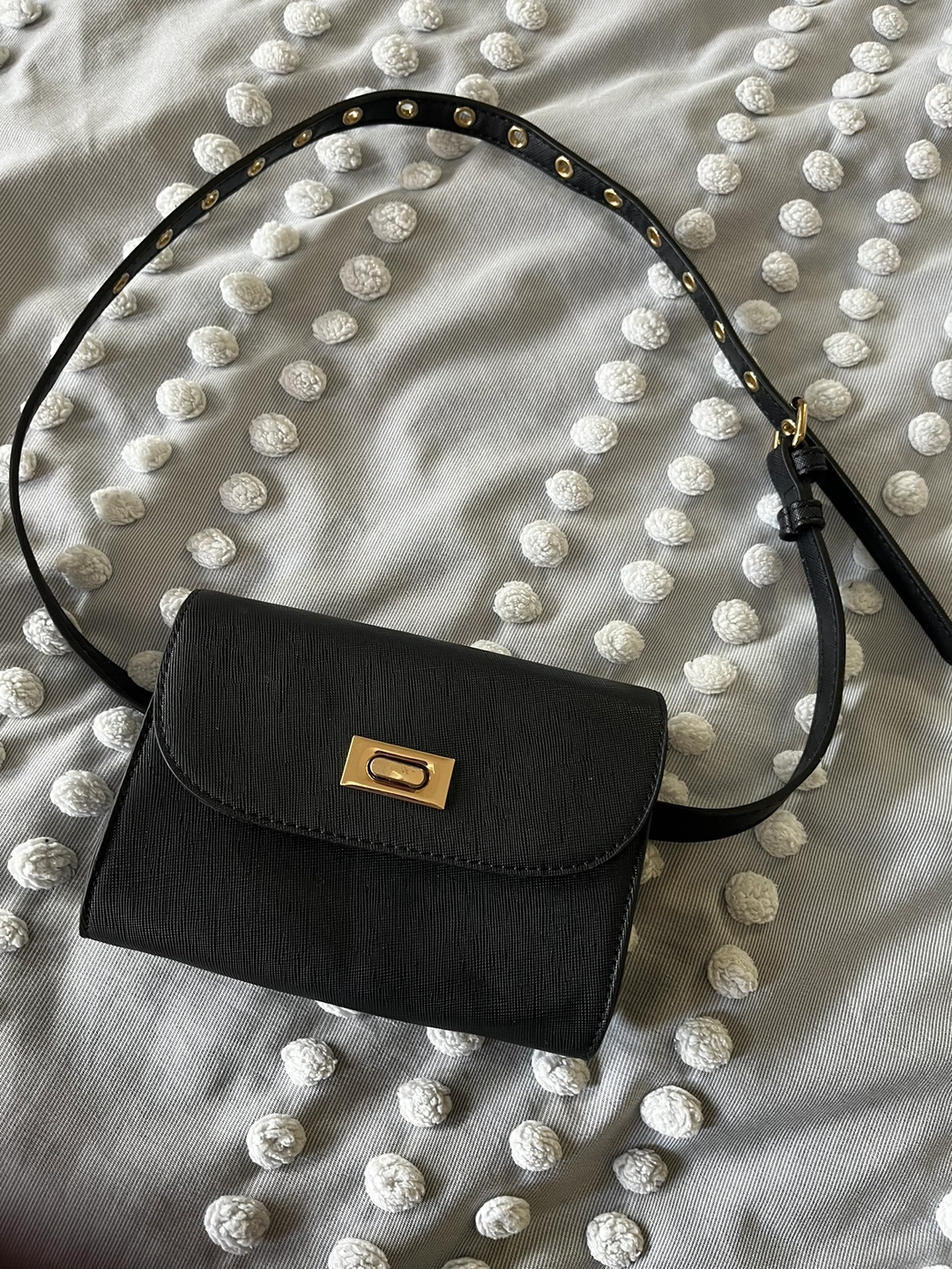 A black belt bag with a gold clasp and gold eyelets. The bag has an adjustable strap.