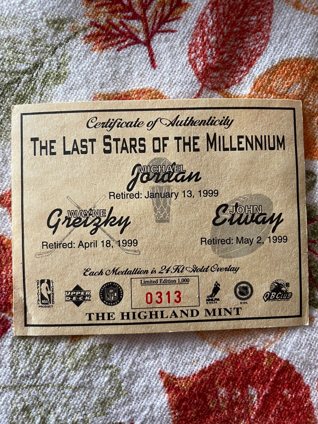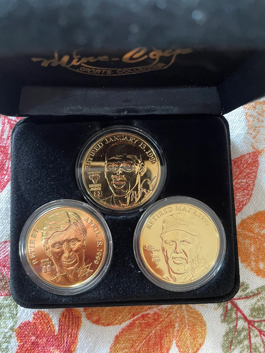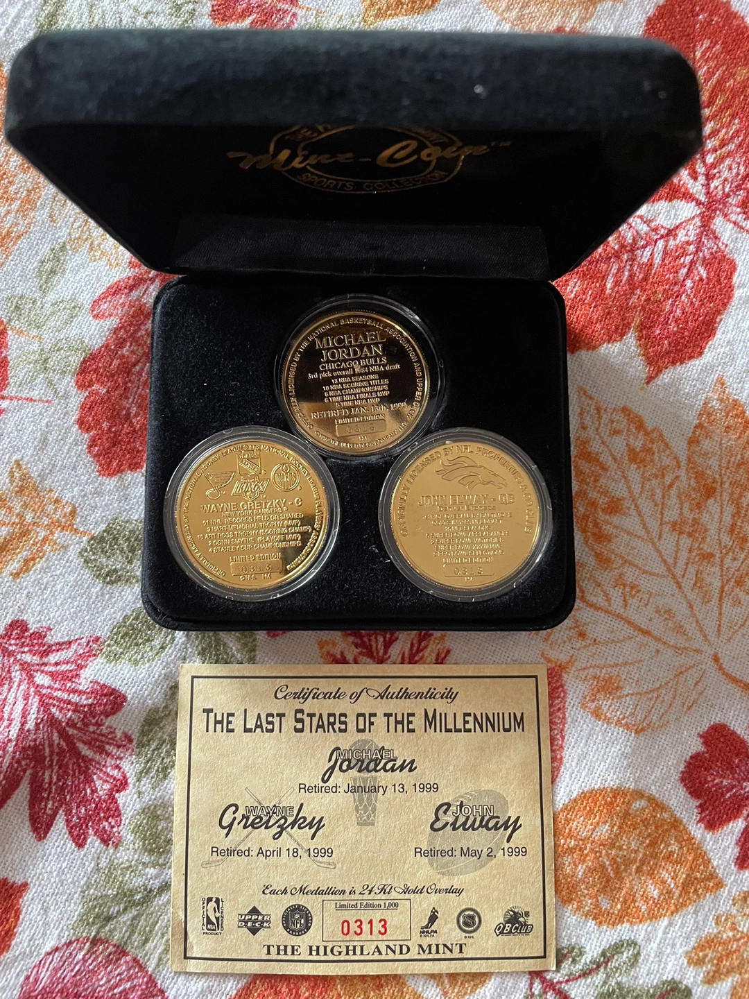 A set of 3 gold-plated coins featuring Michael Jordan, Wayne Gretzky and John Elway. Each coin comes in a black velvet box with a certificate of authenticity from the Highland Mint. The set is numbered 0313 and limited to 1000.