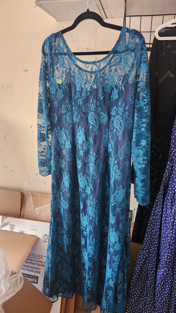 Two long sleeve lace dresses, one black and one teal. beautiful dresses to wear to evening parties or day event.