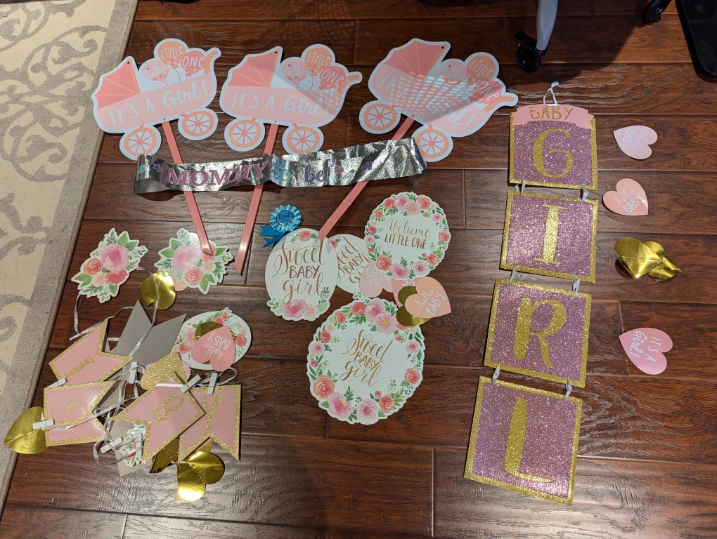 A set of baby girl decorations including banners, 3 garden signs, and other random pieces. Priced low to sell. what you see is what you get.
