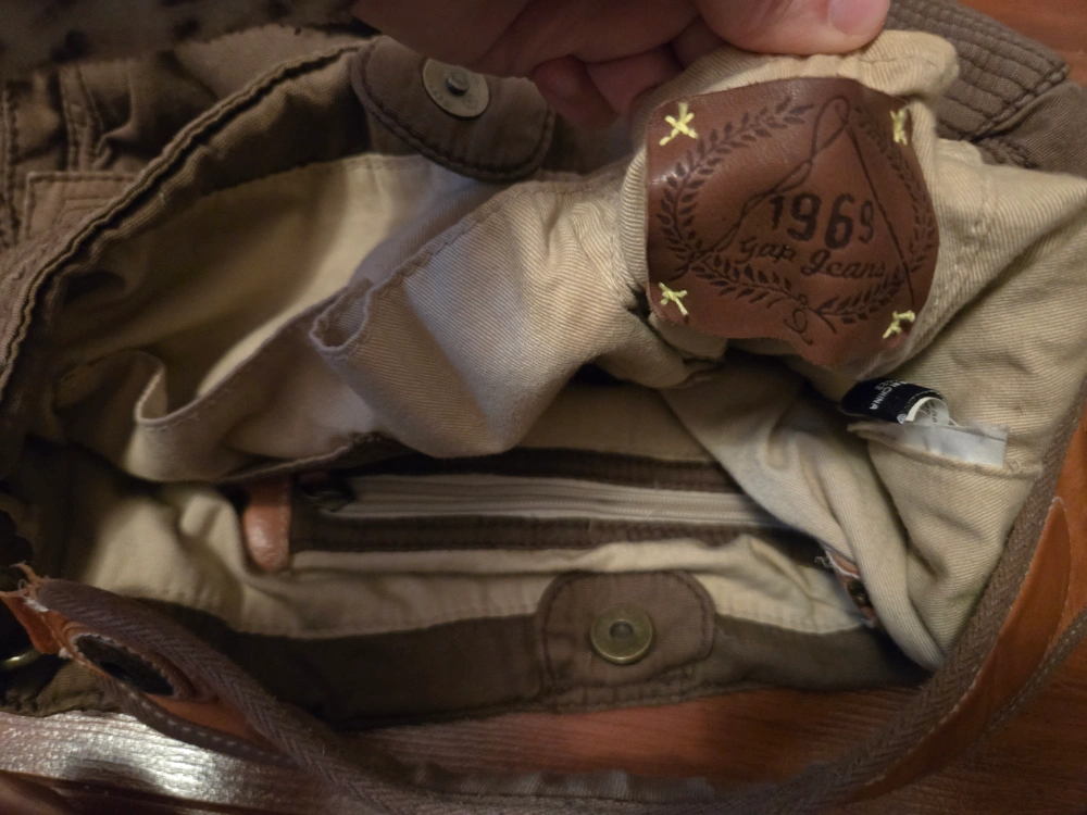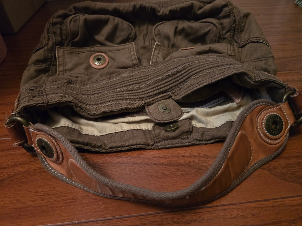 Vintage Gap Canvas Crumpler Bag w/ Inner Pockets & Real Leather Accents Laege green-ish brown-ish canvas bag with brown leather accents and a zippered pocket (& other pockets) on the inside, and 2 pockets with magnetic closures on the outside. The bag has a lots of small pockets (inside and out). The bag is in like-new condition, don't think I ever used it.