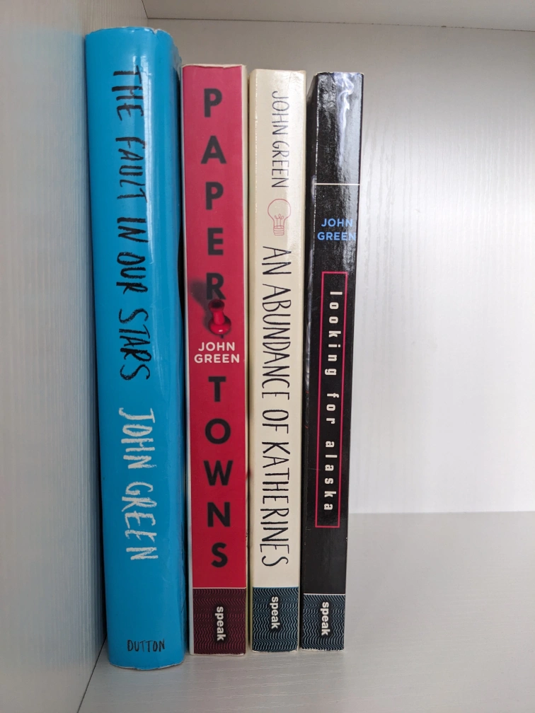 John Green Books in excellent condition: The Fault in Our Stars (Hardcover) Paper Towns (Paperback) An Abundance of Katherines (Paperback) Looking for Alaska (Paperback) $5 each or everything for $15
