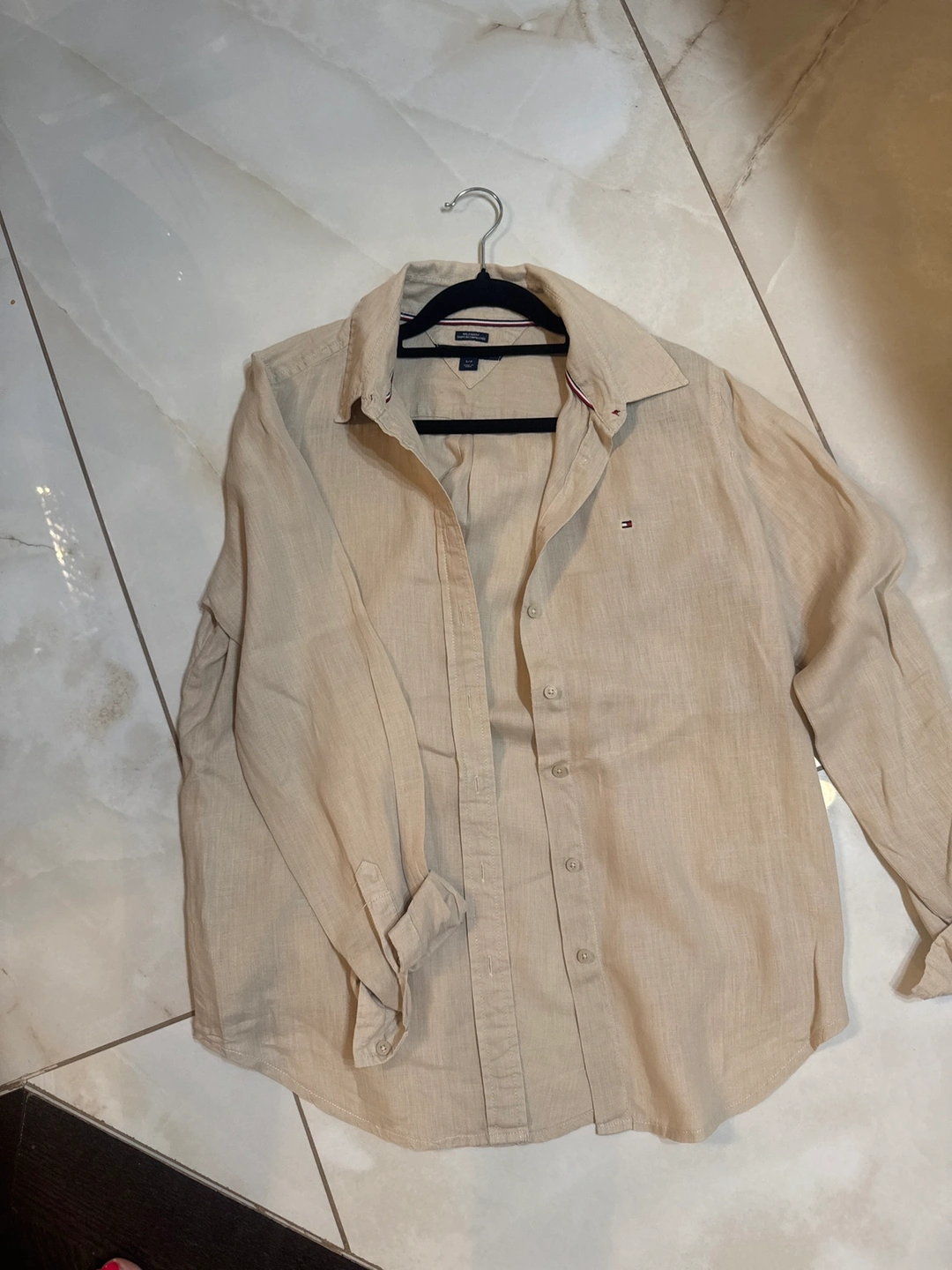Long sleeve beige linen button down shirt with a Tommy Hilfiger logo on the chest.