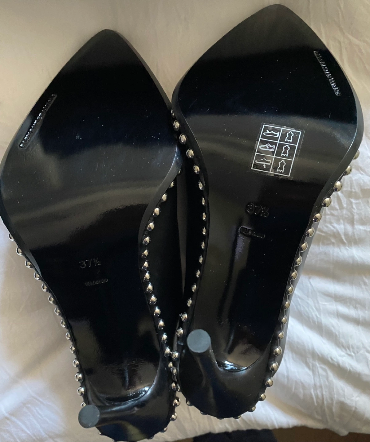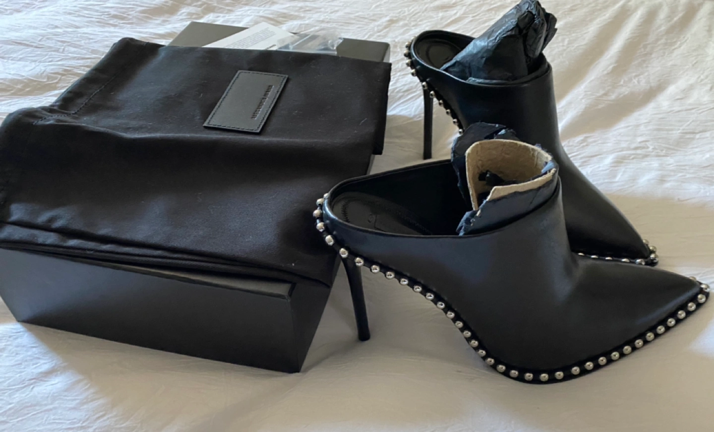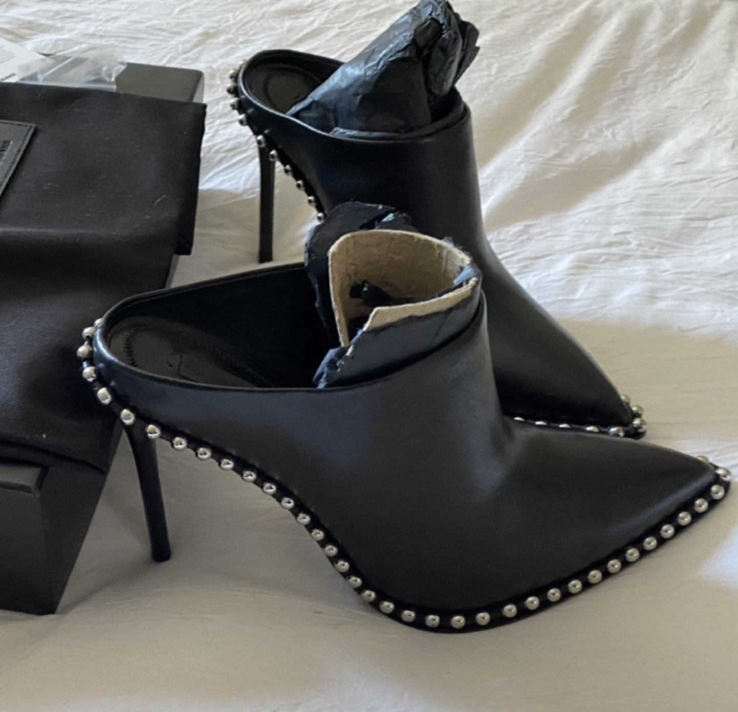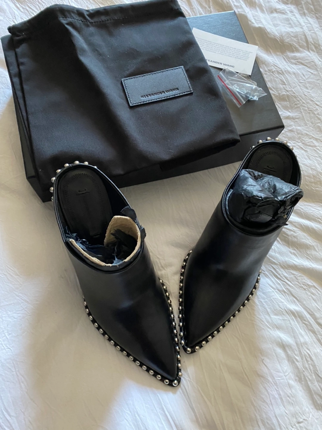 Alexander Wang Eri Studded Mules in size 37.5. I would say they fit large more like an 8 or 38. New in box! I am in love with these, sadly they are a bit too big on me.