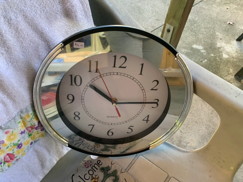 A round clock with a black face and silver trim. The clock works. No use for it now.