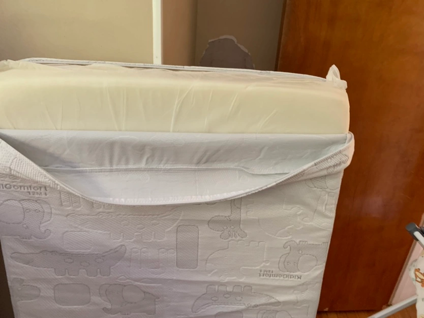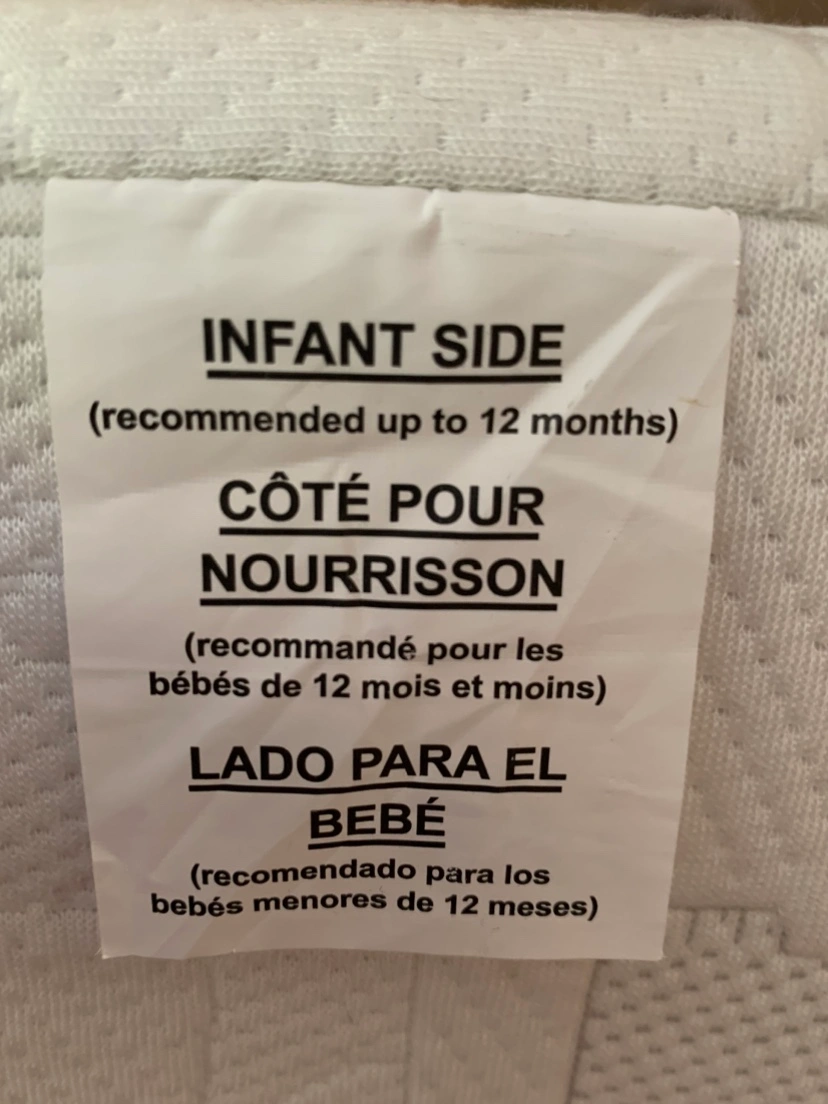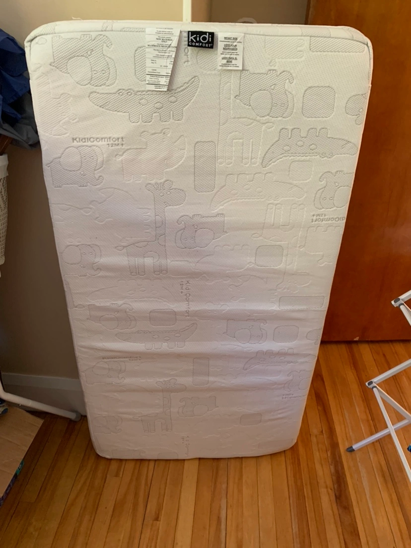 A reversible crib mattress in good condition with a toddler side and an infant side. It has a white fabric cover with animal designs. Like new hardly slept in as our son prefers to co-sleep. $50 firm.