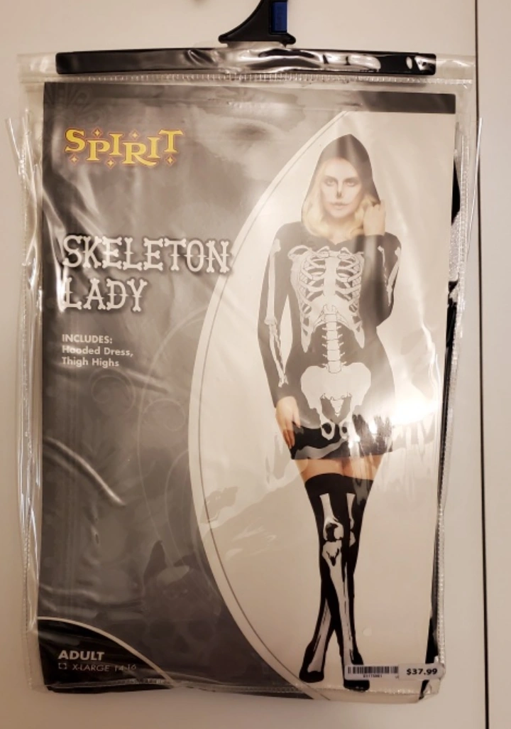 Adult size X-Large costume includes a hooded dress and thigh highs.