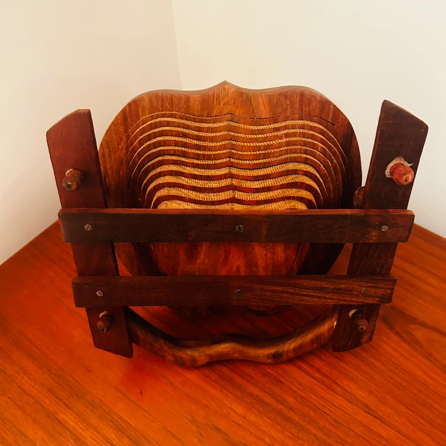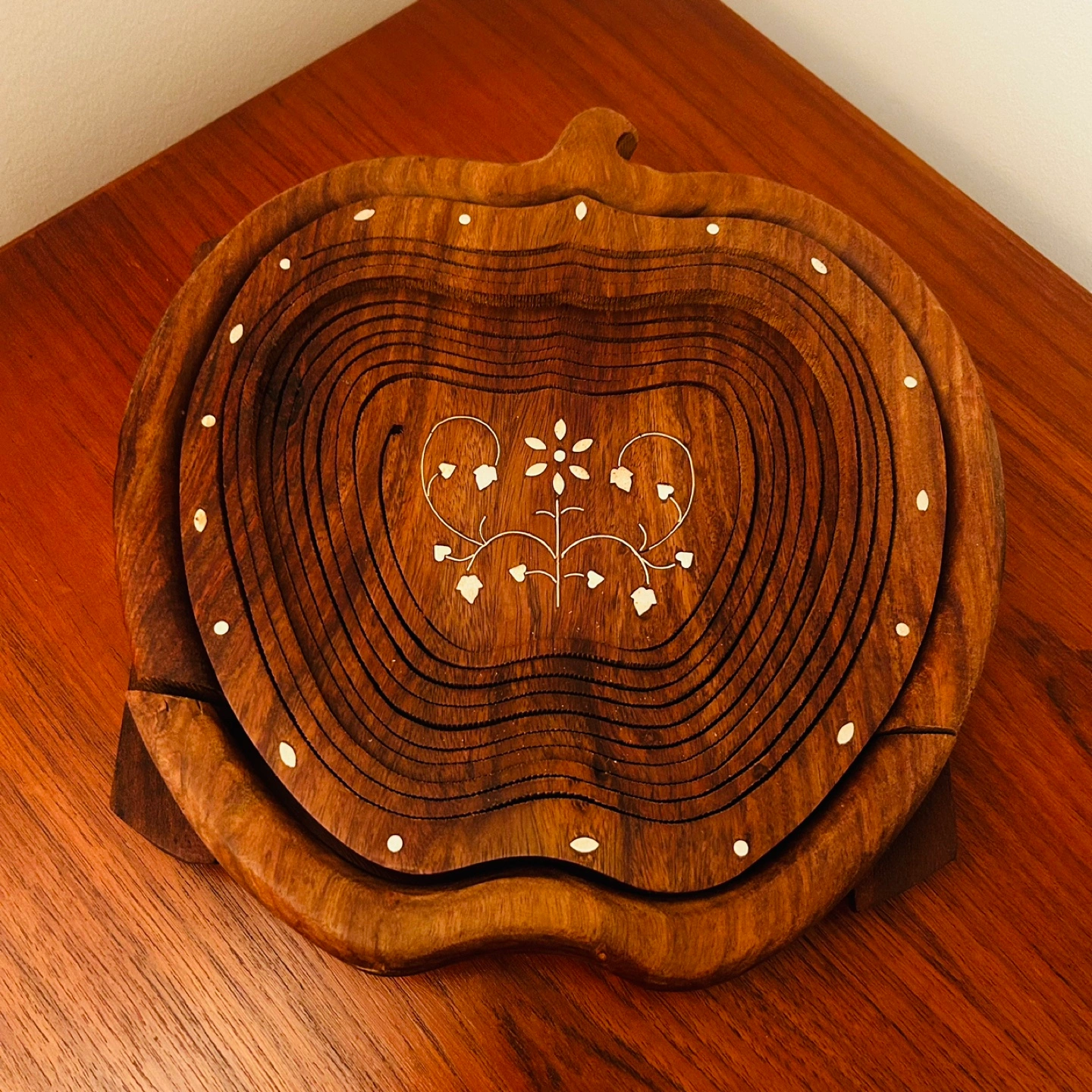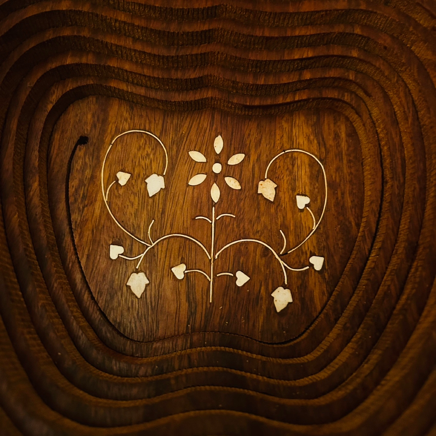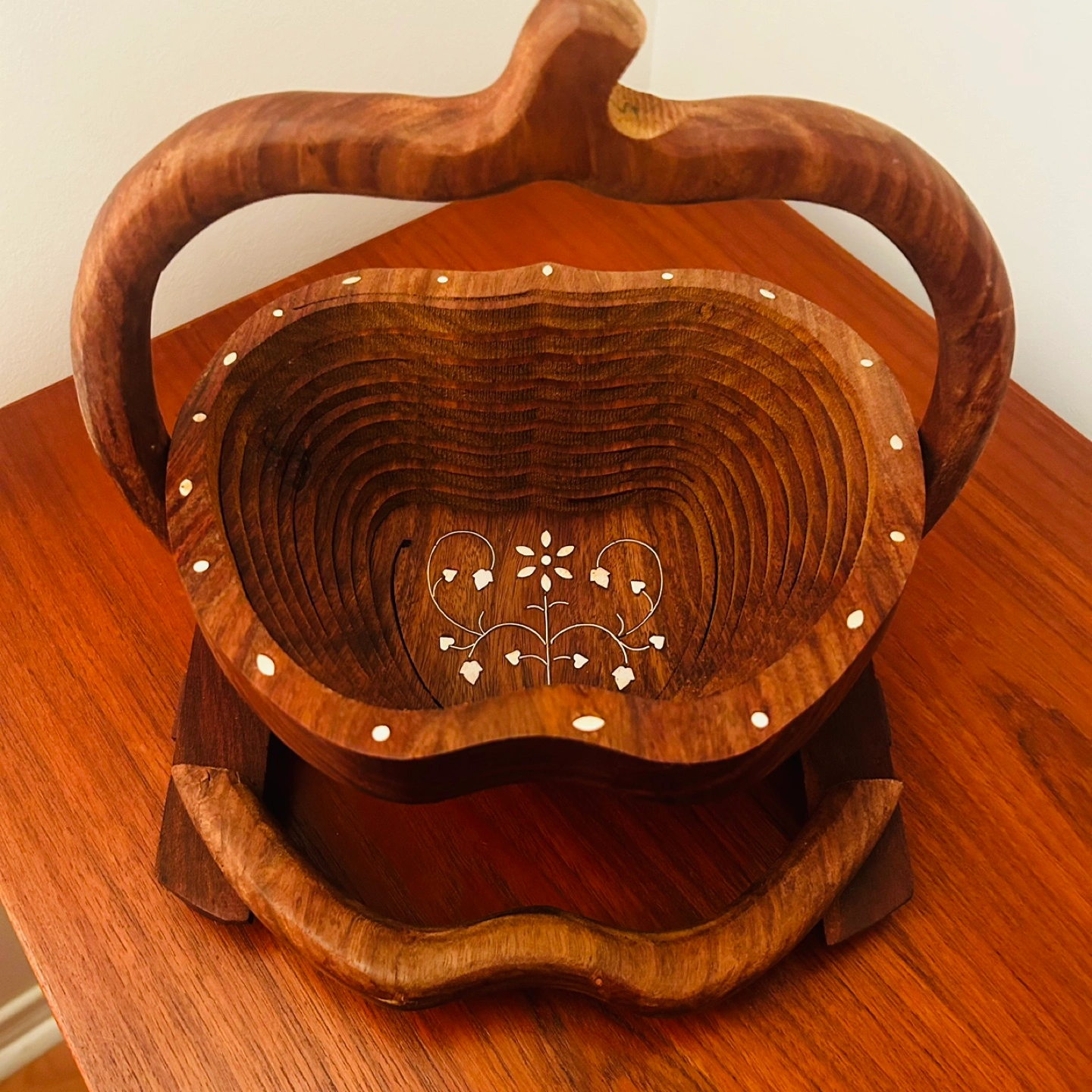 Handmade from beautiful solid wood. It has a floral design inlaid in mother of pearl and can collapse to be stored easily. It has a handle on the side for easy carrying. Great gift ๐