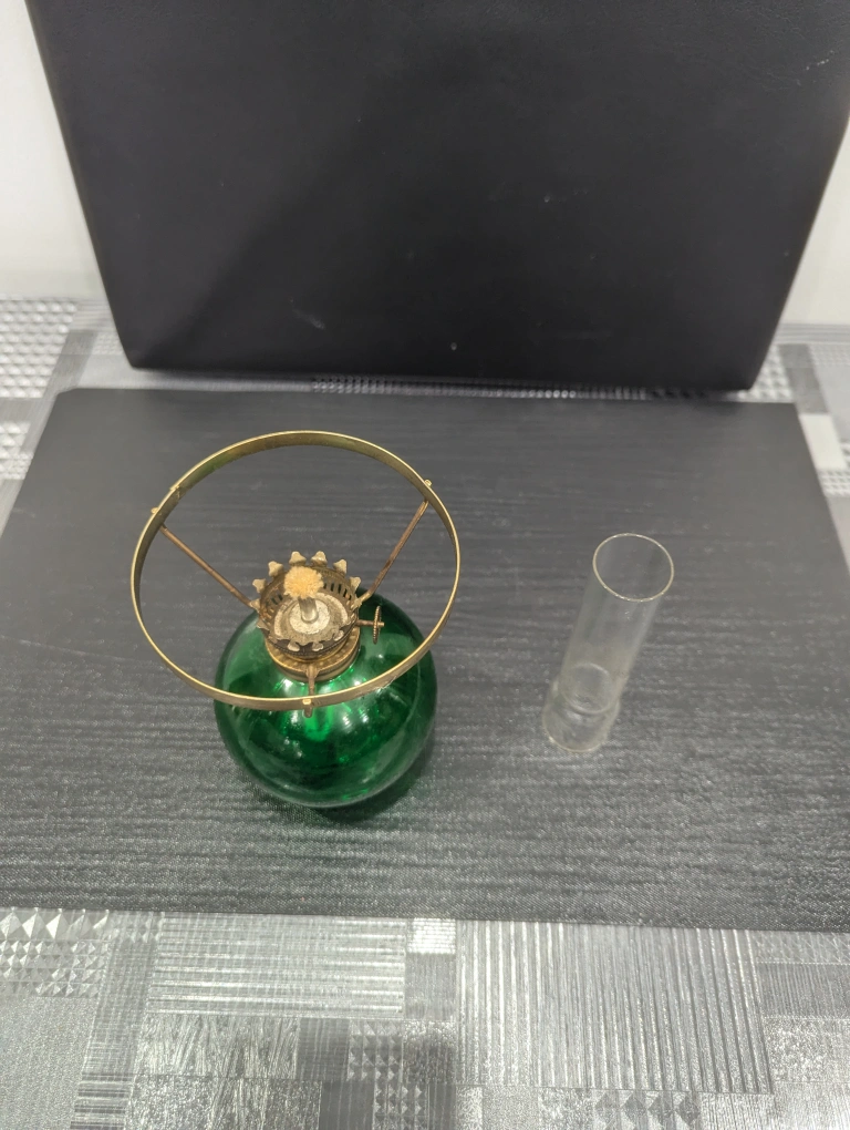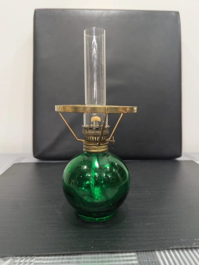 A vintage glass oil lamp with a brass frame, in good condition, standing 9 1/2" tall, with no chips or cracks.