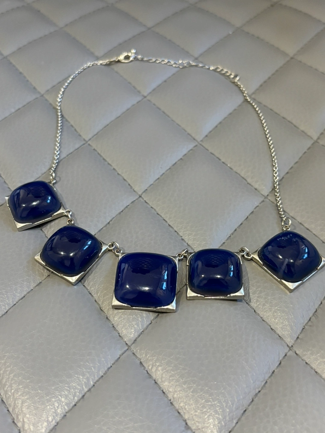 A silver necklace with a chain and four blue stones in square settings. The stones are a dark blue colour.