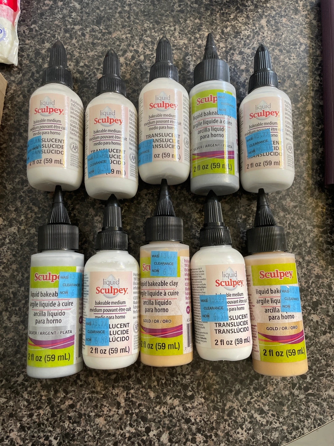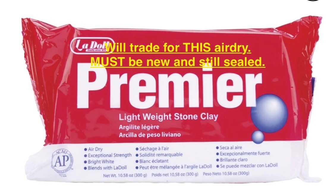 10 Sculpey Liquid Clay in 2 oz bottles. Purchase for $35 or trade for La Doll Premier Lightweight Airdry Clay. Many of the recent base items we are now working on, will not be able to go into the oven, so we have switched to using premier lightweight air dry (second photo for reference and size). You have the choice of purchasing these OR trading. If trading the air dry MUST be sealed (no holes etc) and still useable. Bug free, 3 cat household. No smoking in household. Pickup only.