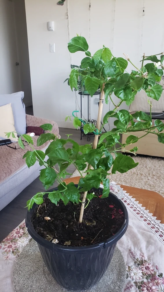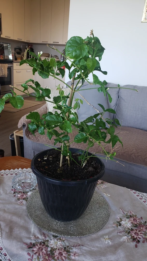 This is a lovely jasmine plant, well established and healthy. It is currently in a 10-inch pot and is about 2 feet tall.