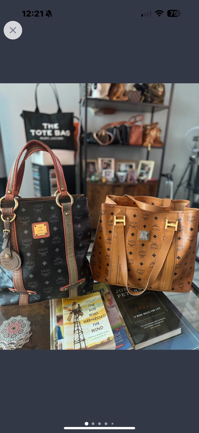 This is a tote bag with a brown and black MCM pattern. The bag features two shoulder straps and a golden clasp closure. Price is for 2 bags Authentic Vintage