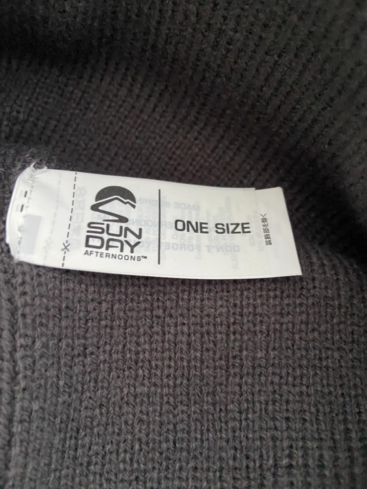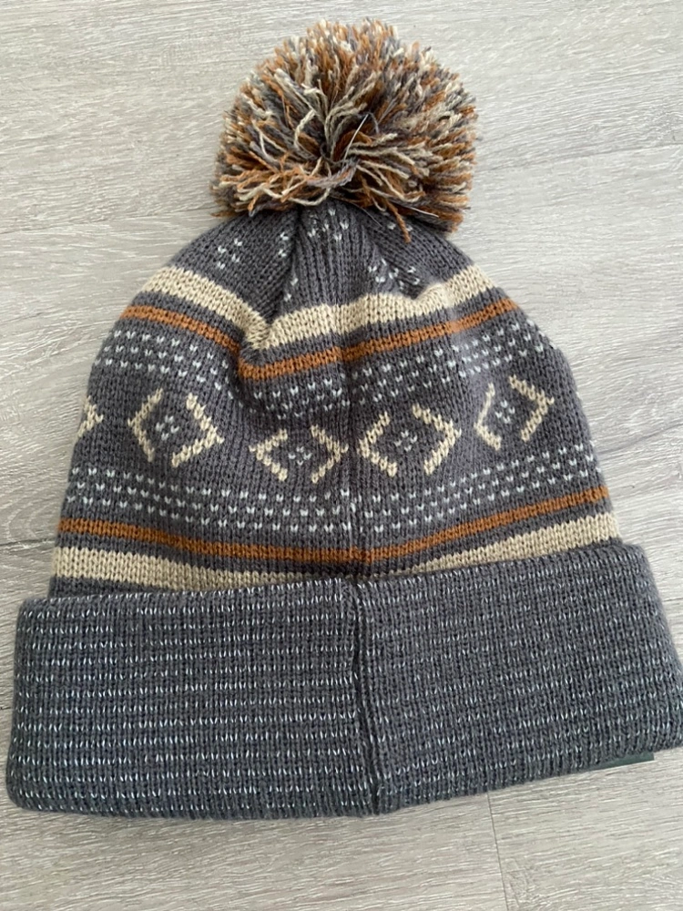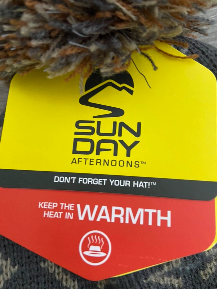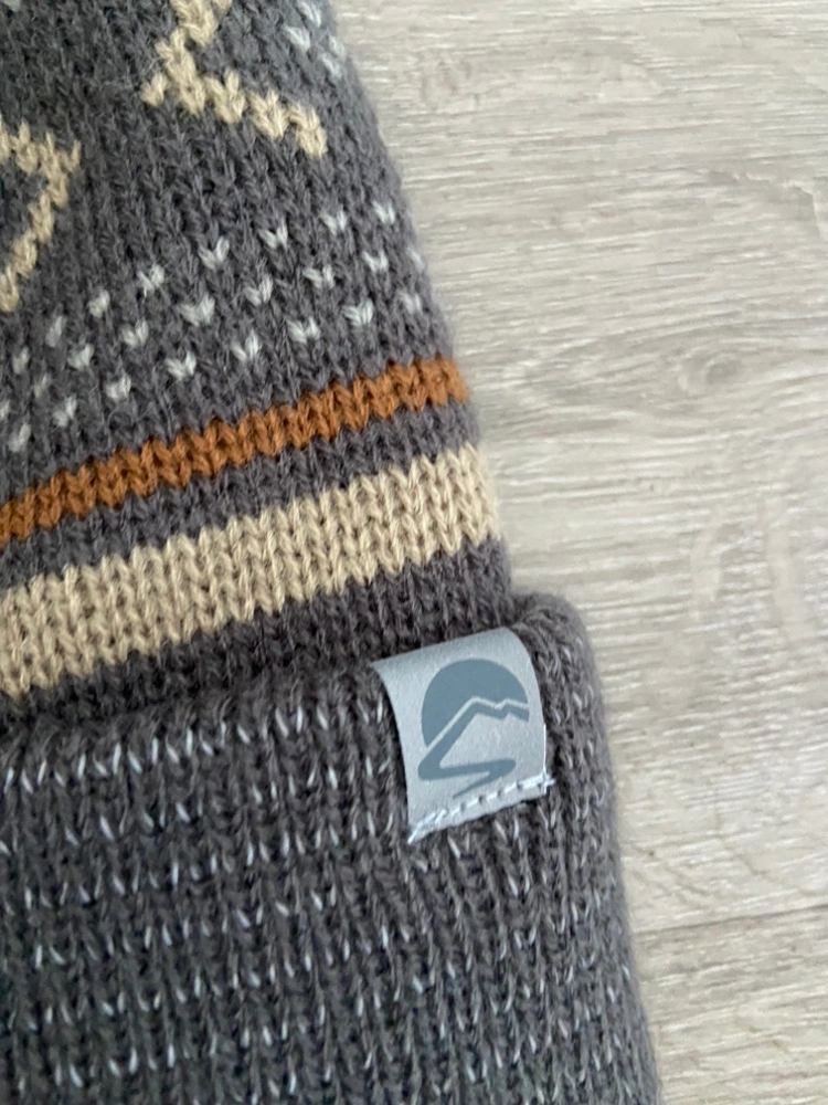 A grey beanie with a pom pom and reflective detailing. The beanie has a geometric pattern and a Sun Day Afternoons logo. This beanie is perfect for cold weather.