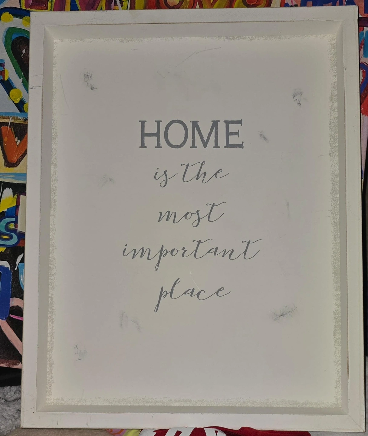 White sign with gray lettering. The sign says 'Home is the most important place'.