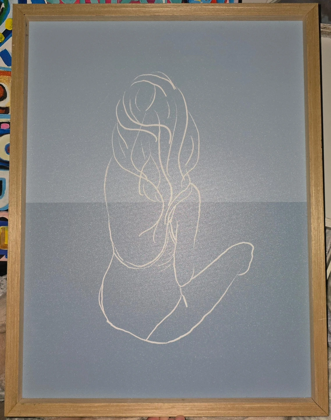 Framed canvas print with an abstract line drawing. Light blue background with white lines depicting a woman's figure.